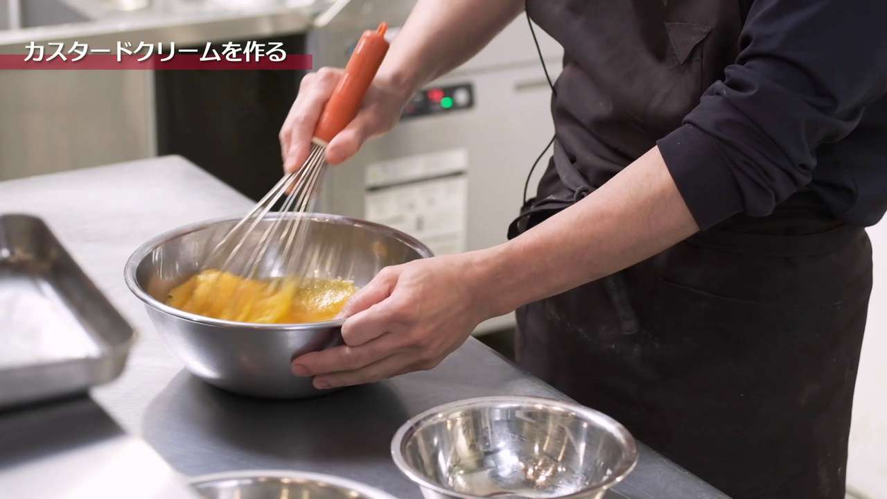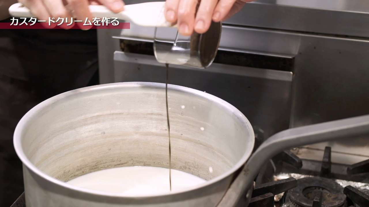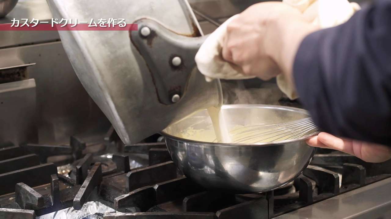 卵黄のボウルに温めた牛乳を半分程度入れてしっかり混ぜ合わせ、残りの牛乳が入った鍋に戻す。強火にかける。