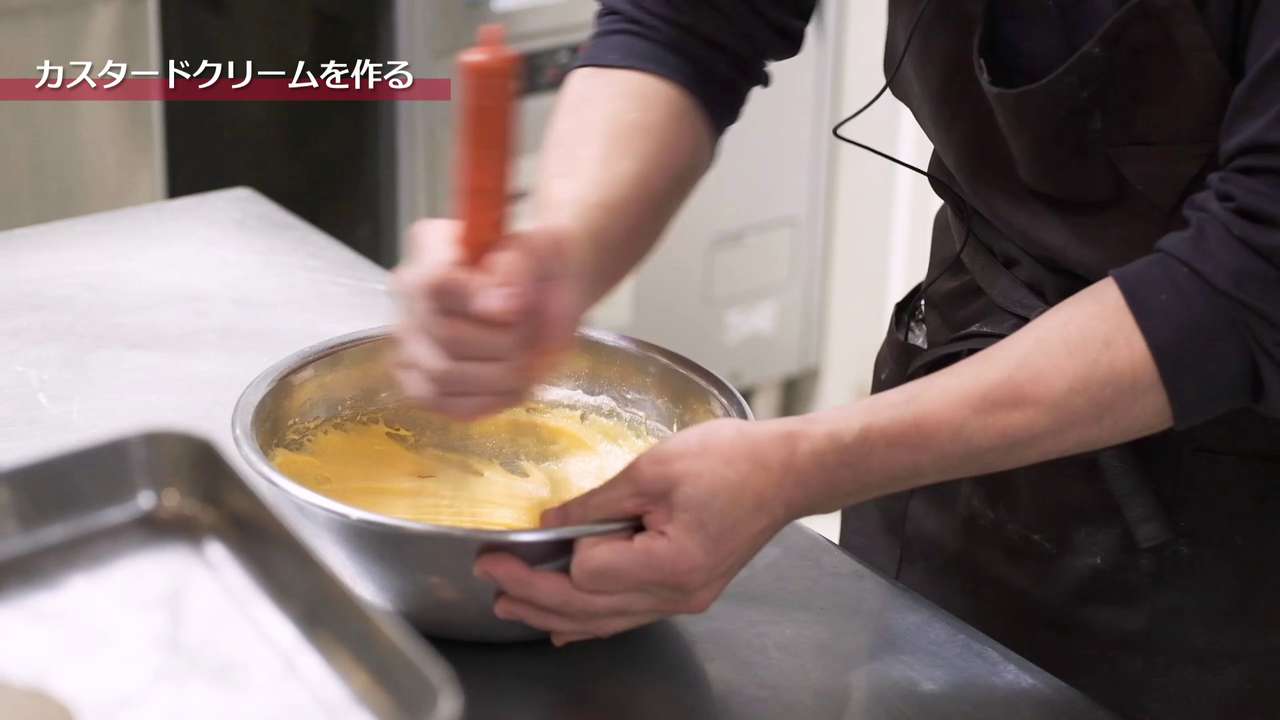 カスタードクリームをボウルに取り出して、ゴムベラでダマにならないようにほぐす。あまり練りすぎないようにする。