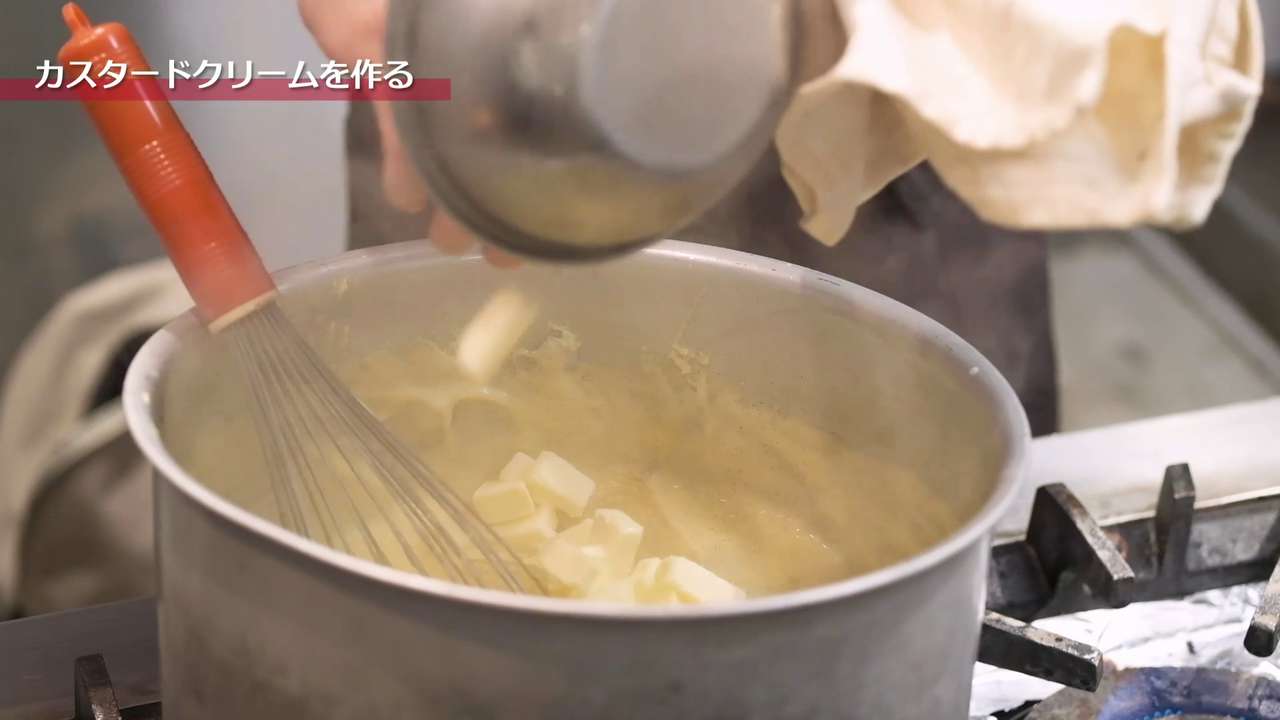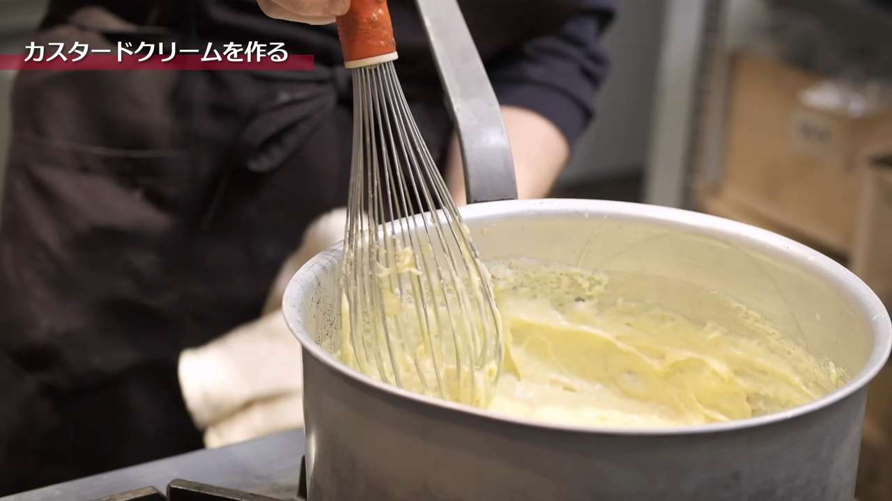 ホイッパーで焦げつかないように混ぜながら、ツヤが出るまでしっかり炊く。液体を混ぜるのではなく鍋肌を混ぜるイメージで行う。ボコボコしている泡がサラッとしてくるまで行う。