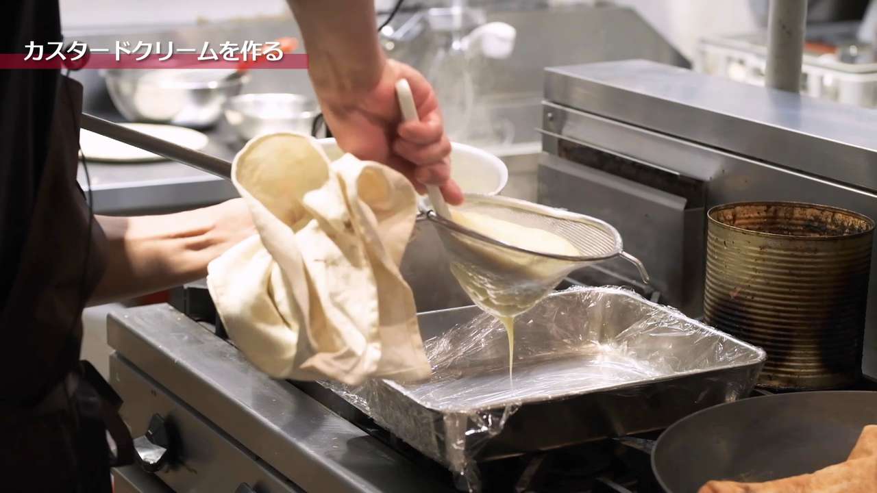 ラップを敷いたバットに、ザルで漉しながら移す。