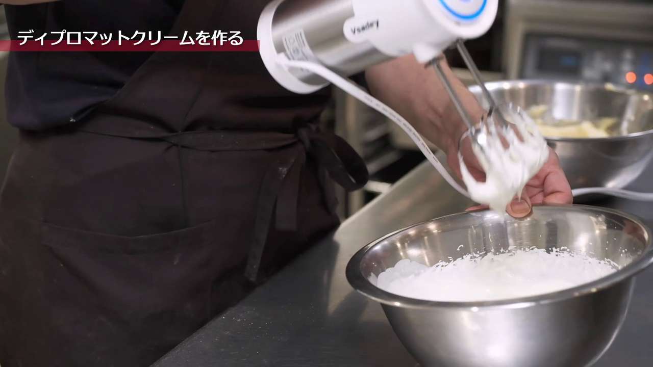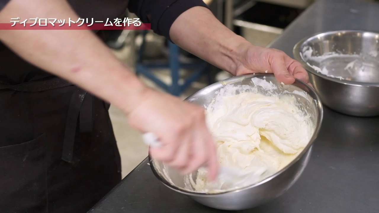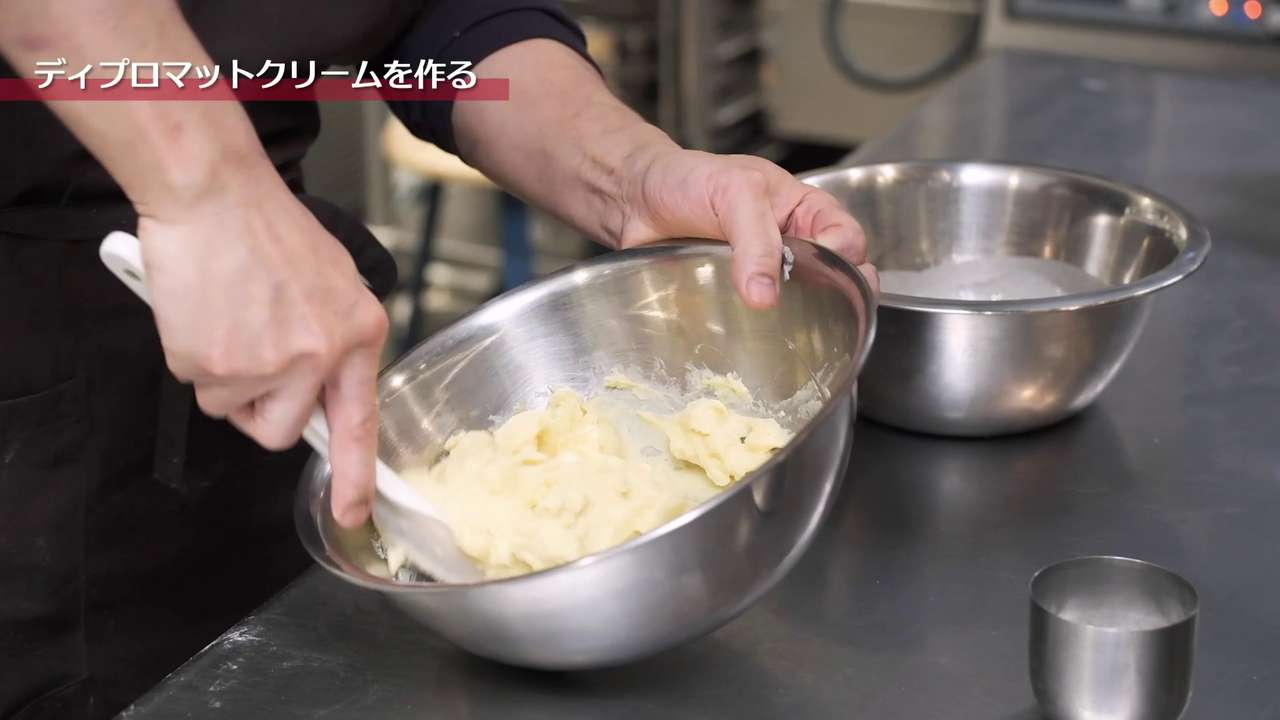 カスタードクリームに生クリームを3回に分けて混ぜ合わせる。ボウルの底の方から持ち上げるように軽く混ぜ合わせる。混ぜ過ぎるとダレてしまうので注意。