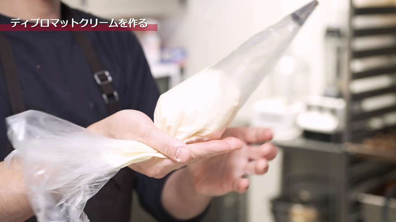 ディプロマットクリームを丸口金をセットした絞り袋に入れる。