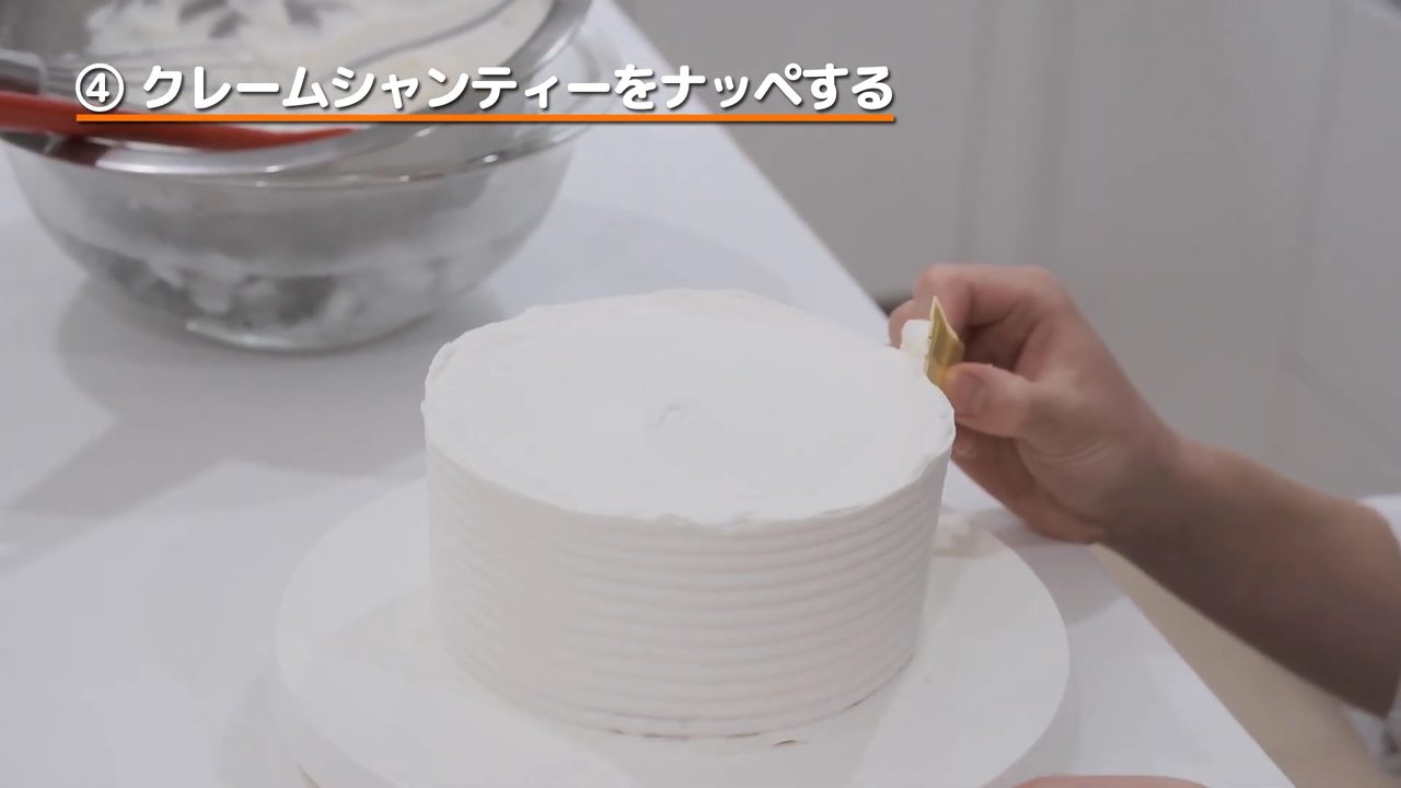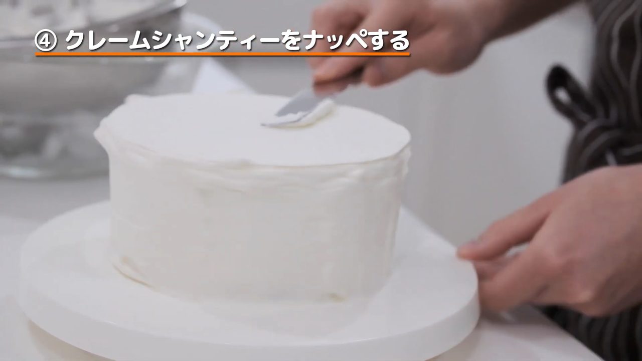回転台に移して、7分立てにしたクリーム(1/2量)で全体をナッペする。- 7