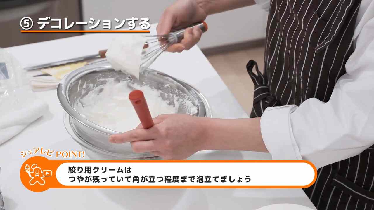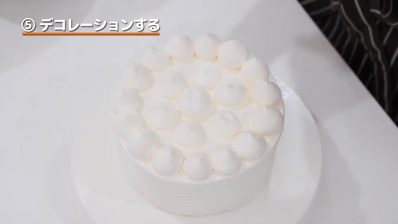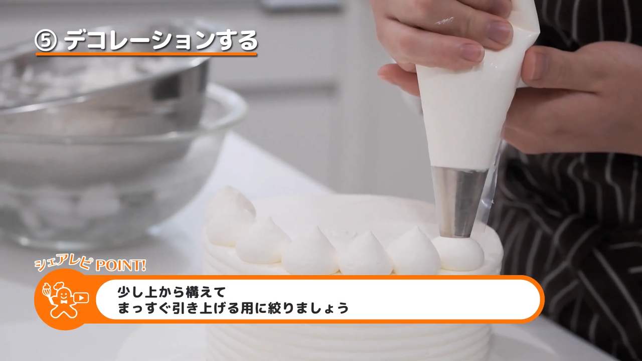 残りのクリームを角が立つ位まで泡立てて、丸口金を付けた絞り袋に入れる。表面に一周絞る。- 9