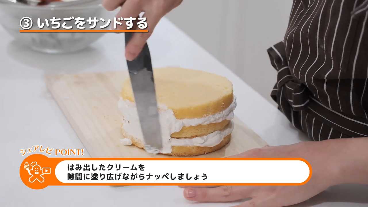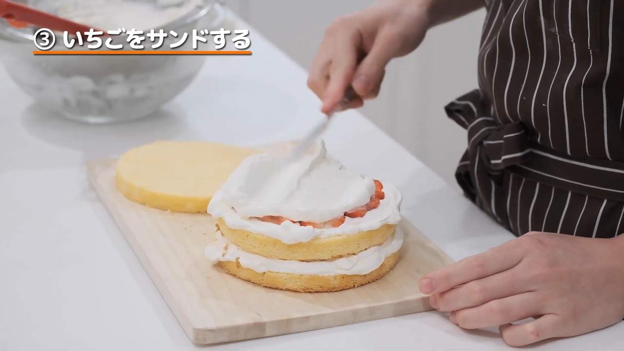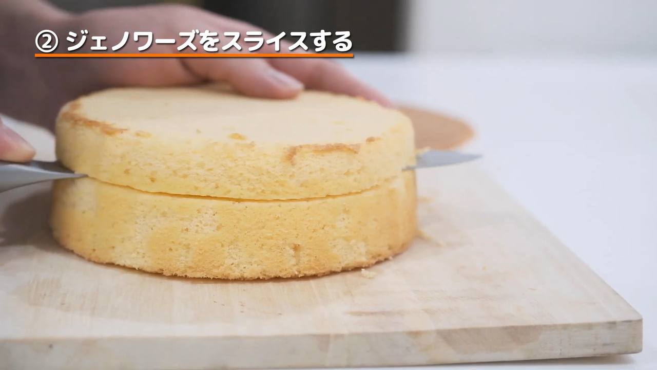 クリームを塗って真ん中のジェノワーズを重ね、同じ工程を繰り返す。- 5