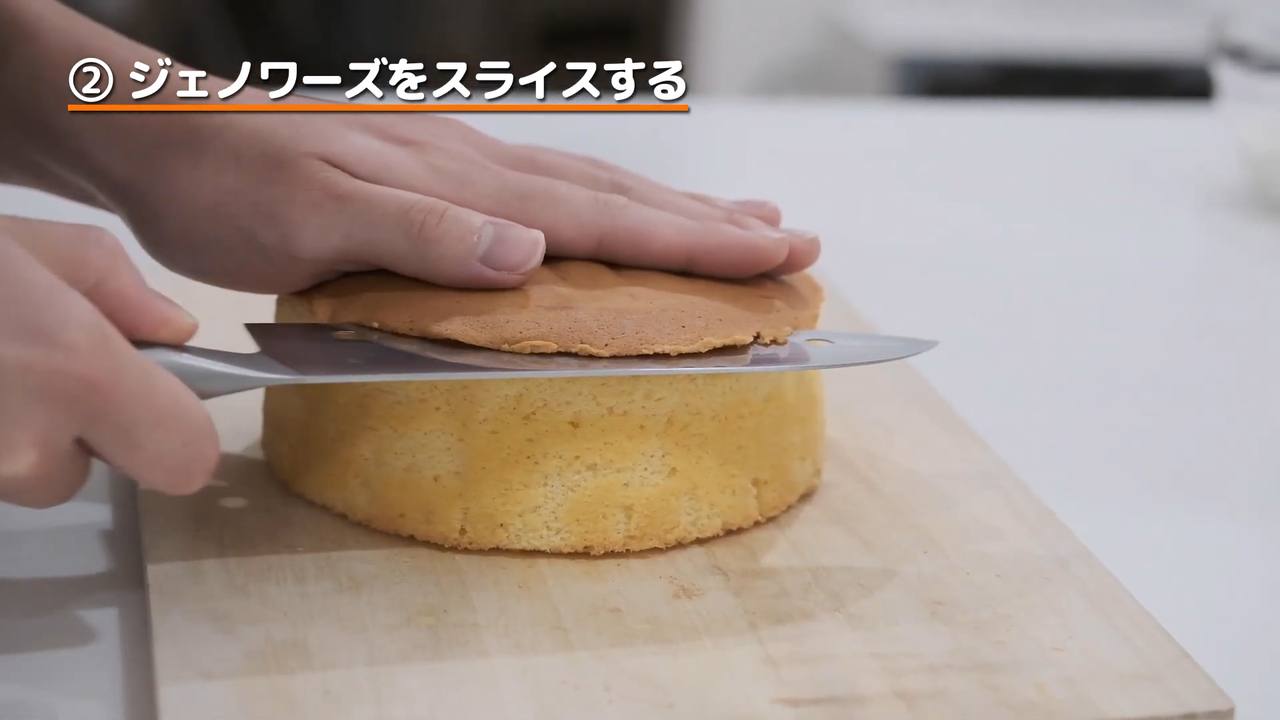 冷ましたジェノワーズの焼き面を薄くスライスして取り除く。
