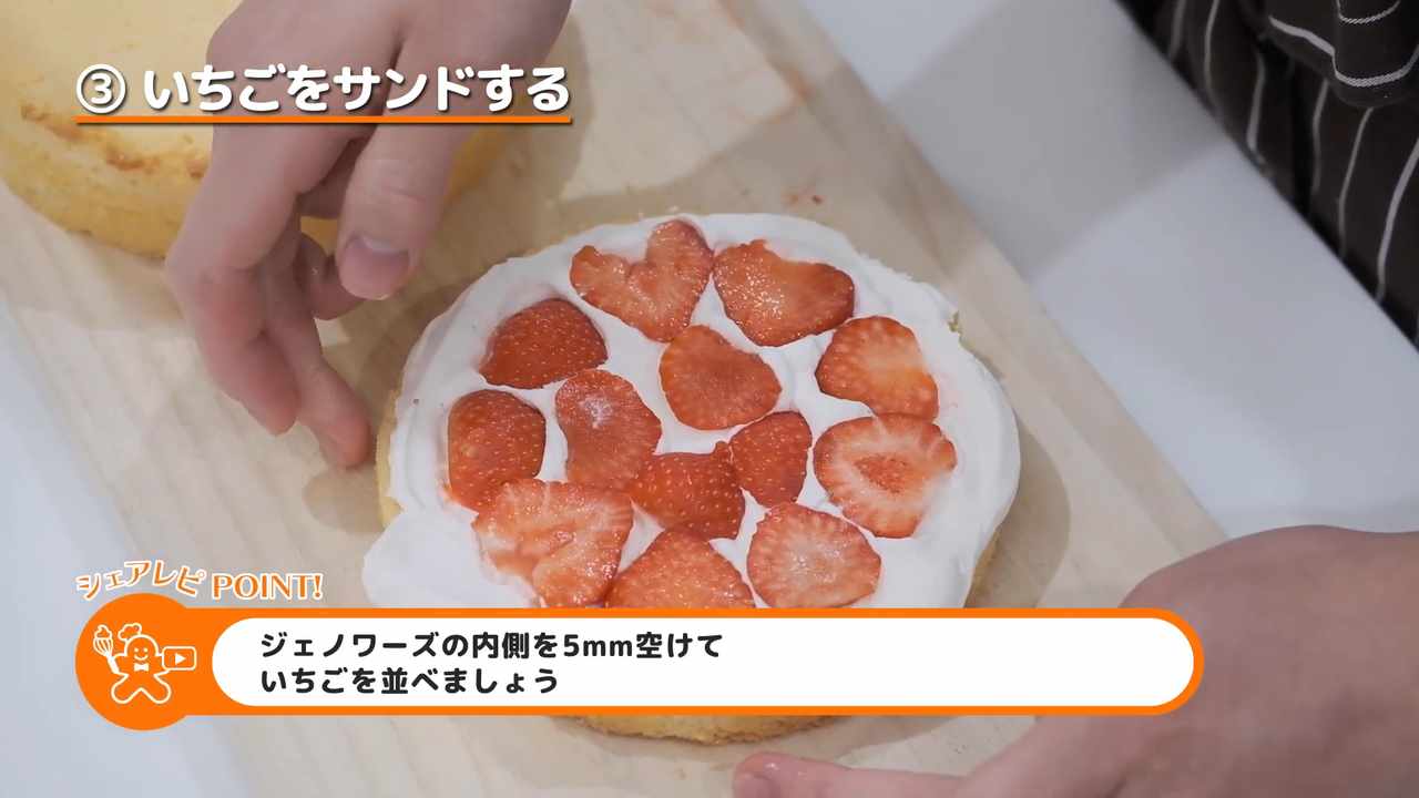 いちごのへたを取り除いて5mm厚にスライスし、並べる。※内側を5mm位空けること。- 4