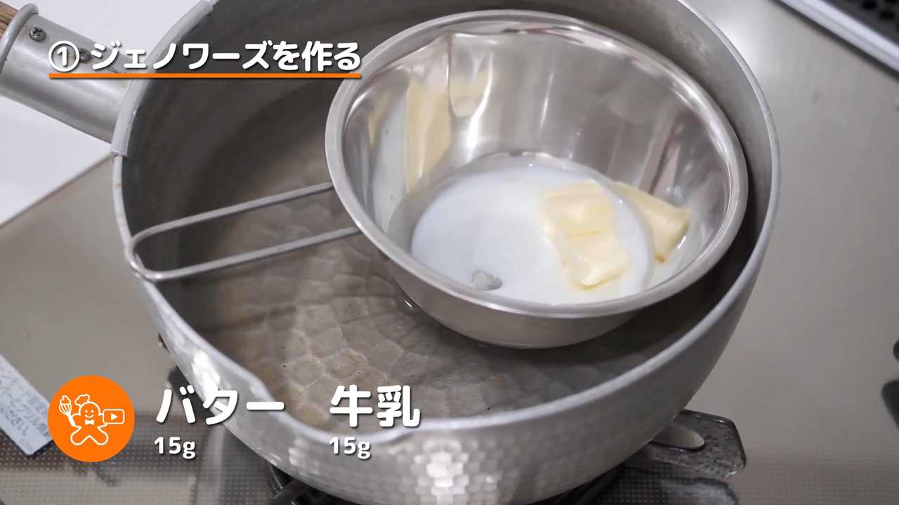 別のボウルにバターと牛乳を入れて、湯煎でバターを溶かす。- 4