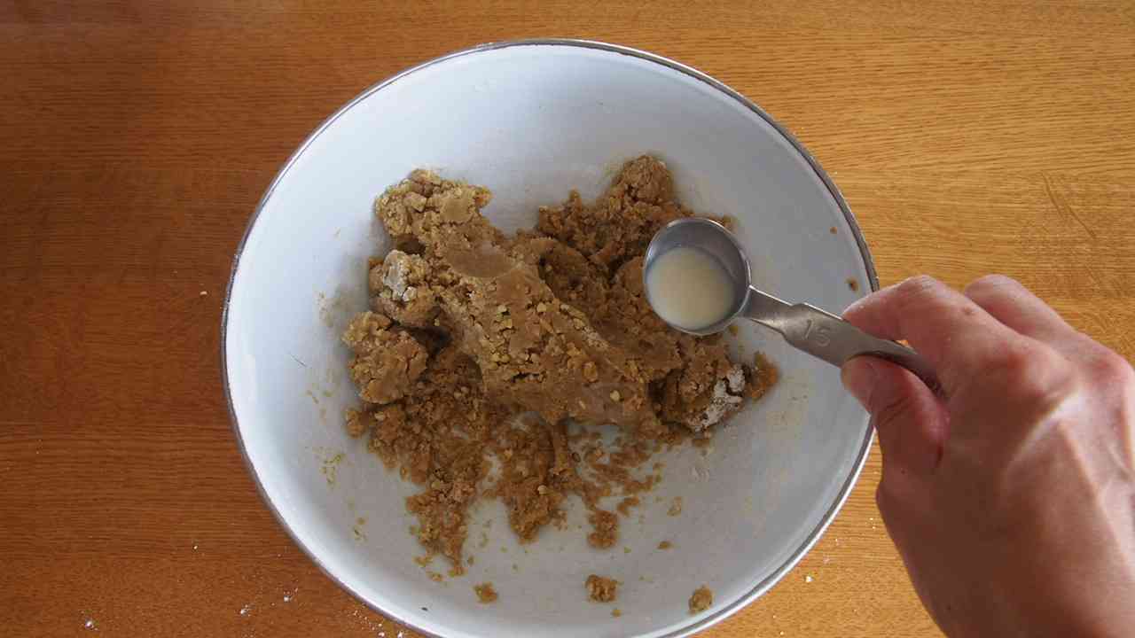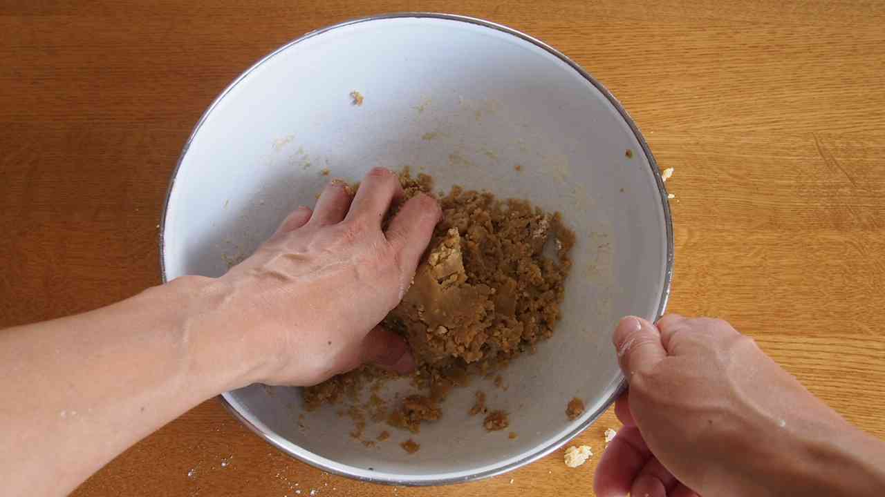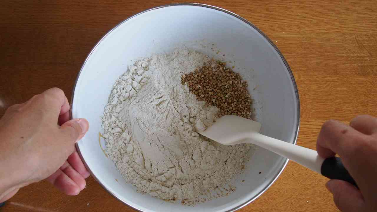 ふるった強力粉とそば粉、炒ったそばの実を混ぜる。- 5