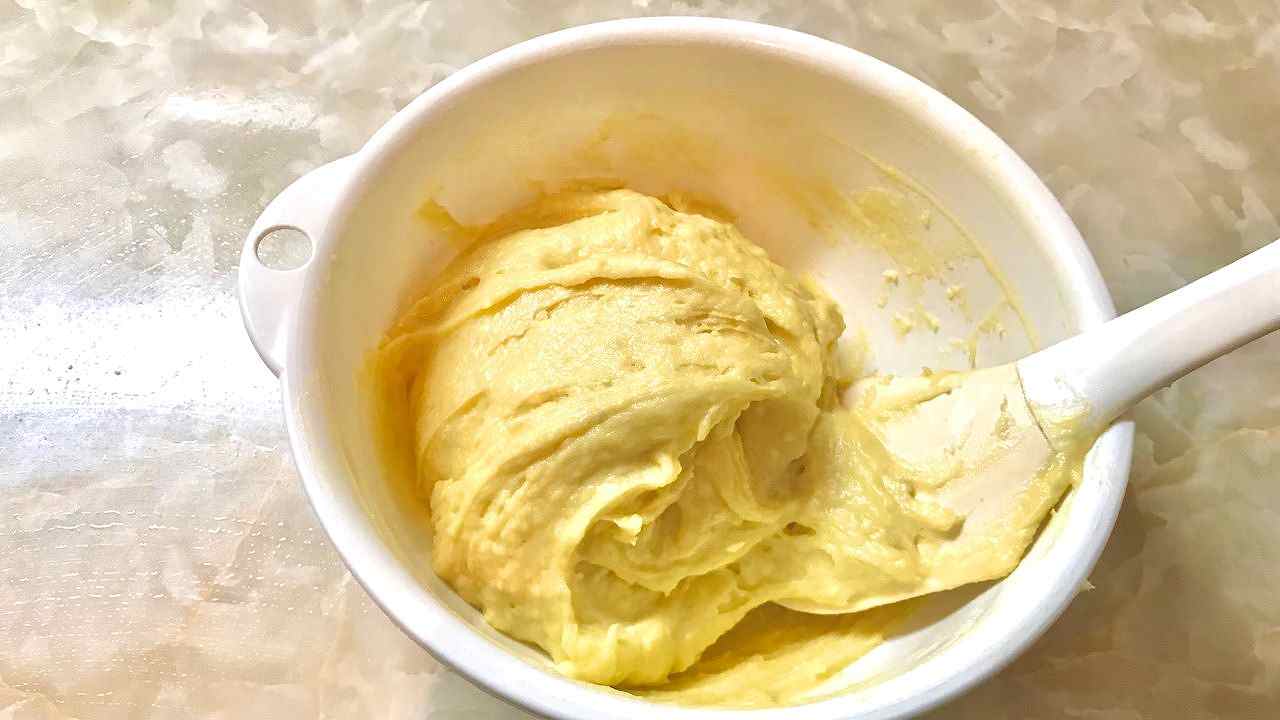 また、混ぜが足りないと膨らみや食感が悪くなるので注意してください。生地に少しツヤが出るまで縦に切るように混ぜるのがコツです。