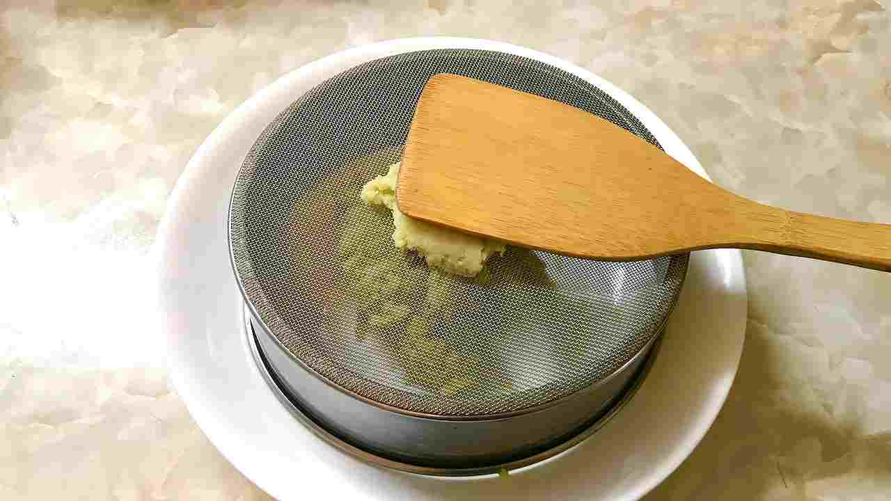 さつまいもは皮をむき、蒸して柔かくし、熱いうちに裏ごしをします。(レンジ加熱の場合は、500Wで2分半~3分半が目安)