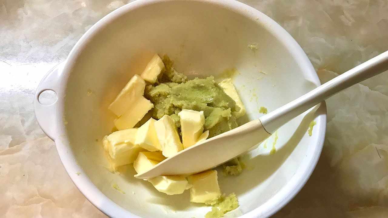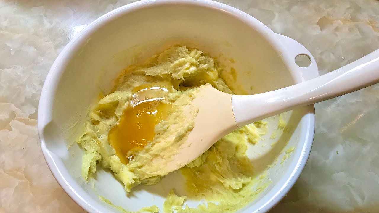 3のサツマイモの裏ごしに4を半量加え、ボウルの底から生地をすくうように混ぜ合わせます。練らずに切るように混ぜることがポイントです。
