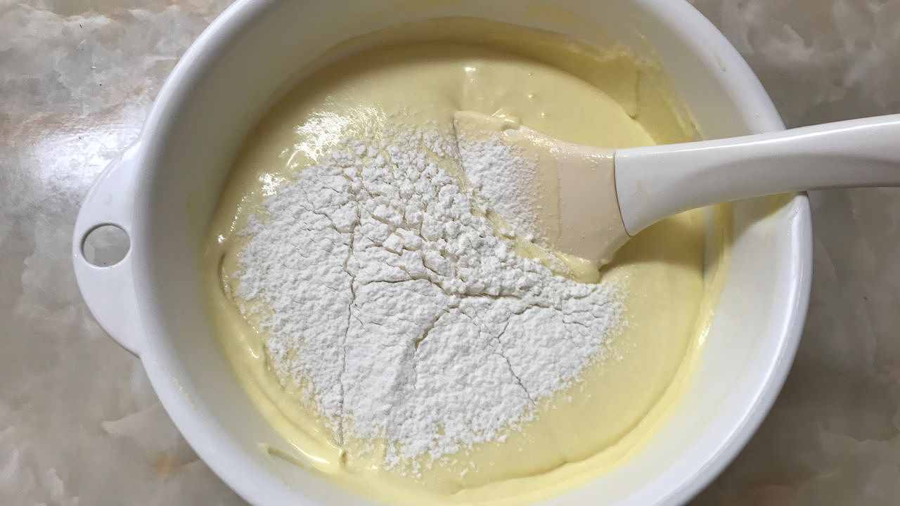 5に薄力粉を入れ、ゴムべらで切るように混ぜ合わせます。