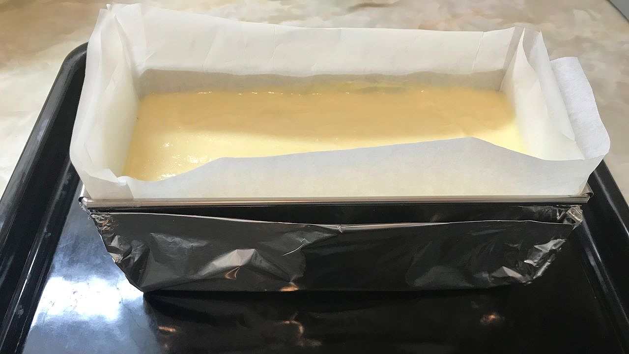 ※底が抜けるタイプの型は、画像のようにアルミホイルで底を包んでください。