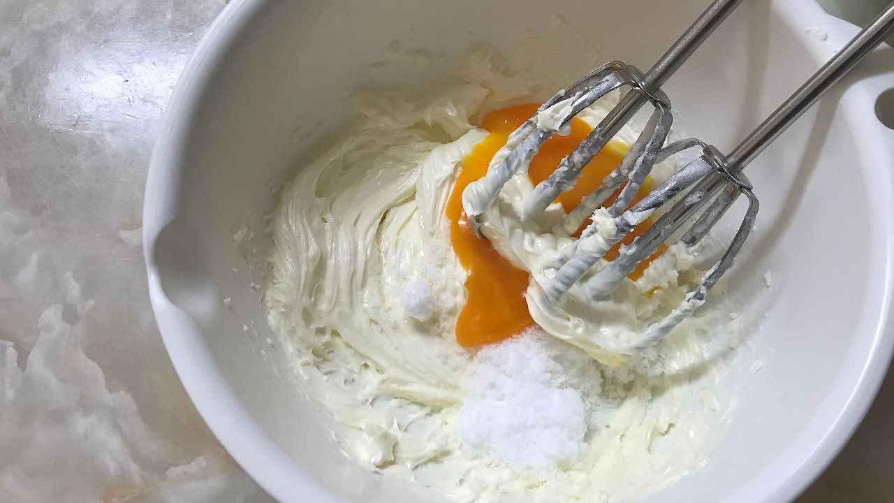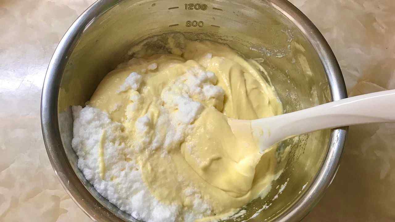 クリームチーズをなめらかになるまで練り、レモン果汁、砂糖半量(20g)、卵黄を入れてハンドミキサー(低速)または泡立て器で混ぜ合わせます。