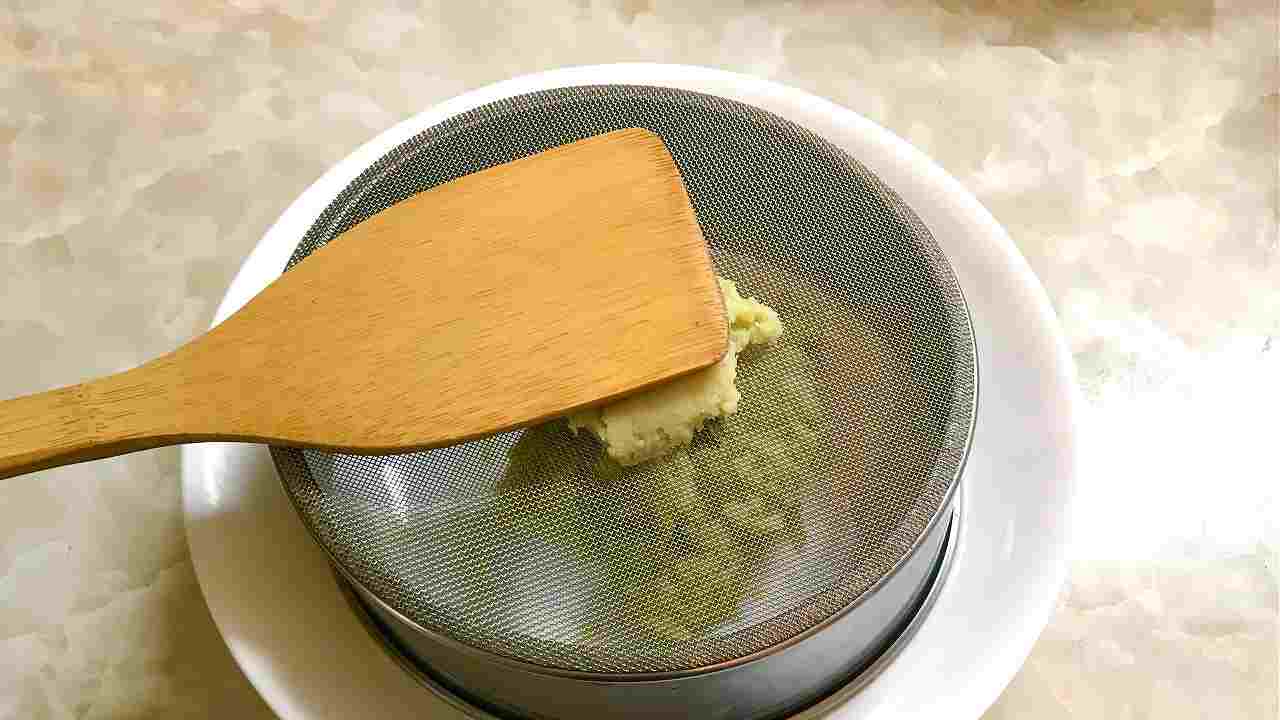 さつまいもは柔らかくなるまで蒸して皮をむき(レンジ加熱の場合は、500Wで2分半~3分半が目安)、熱いうちに裏ごしをします。→冷ましておきます。