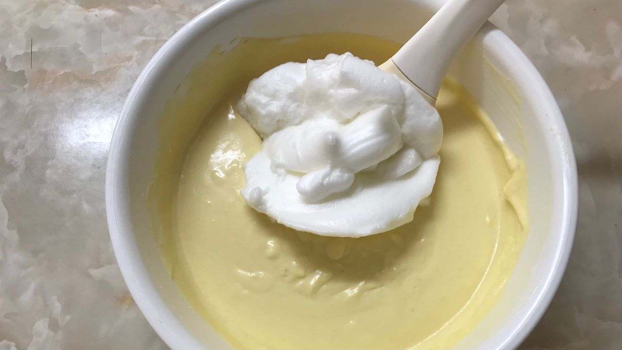 3に4のメレンゲ1/3量を加えて、ゴムべらでしっかりと混ぜ合わせます。