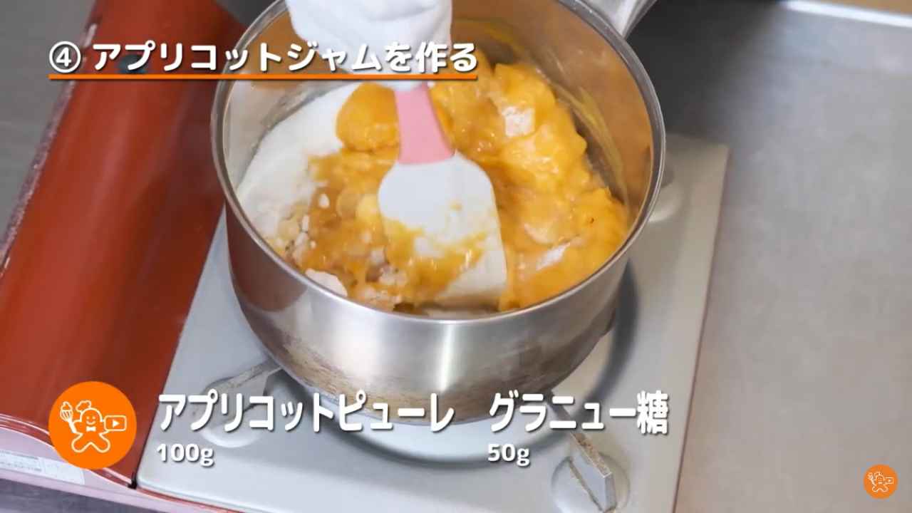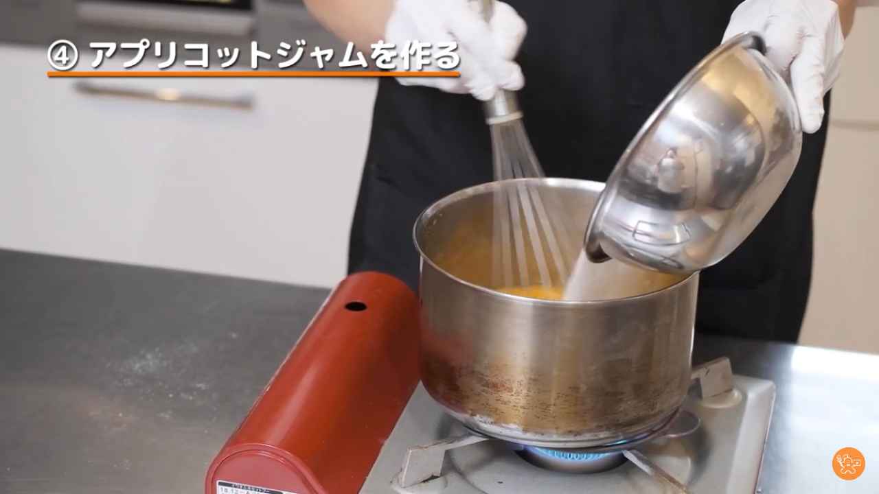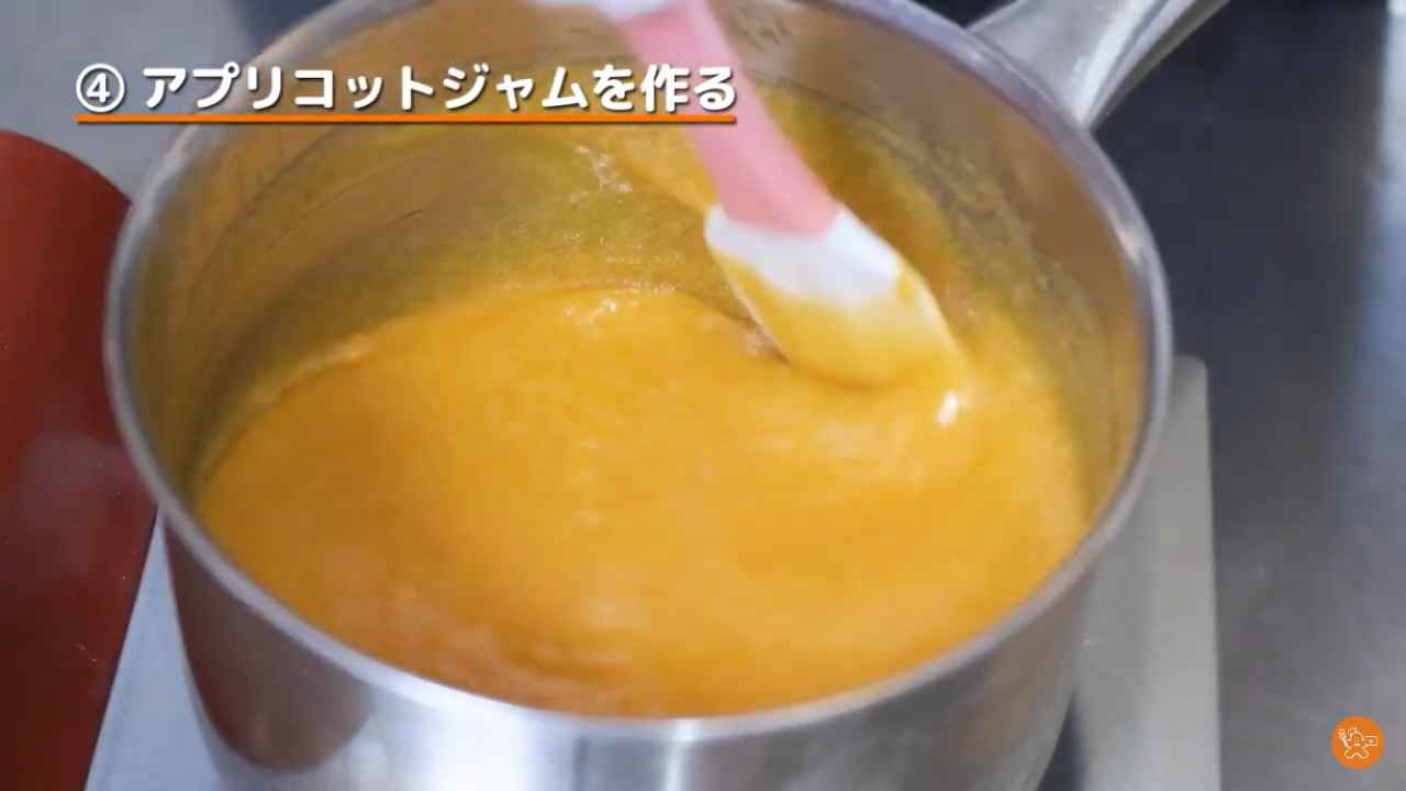 アプリコットジャムを火にかけ、水を少し足す。塗りやすい固さに調節する。