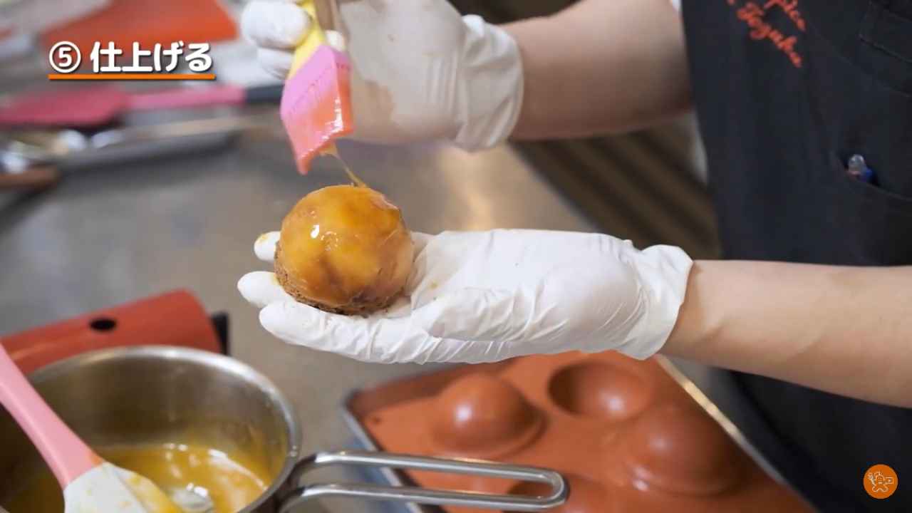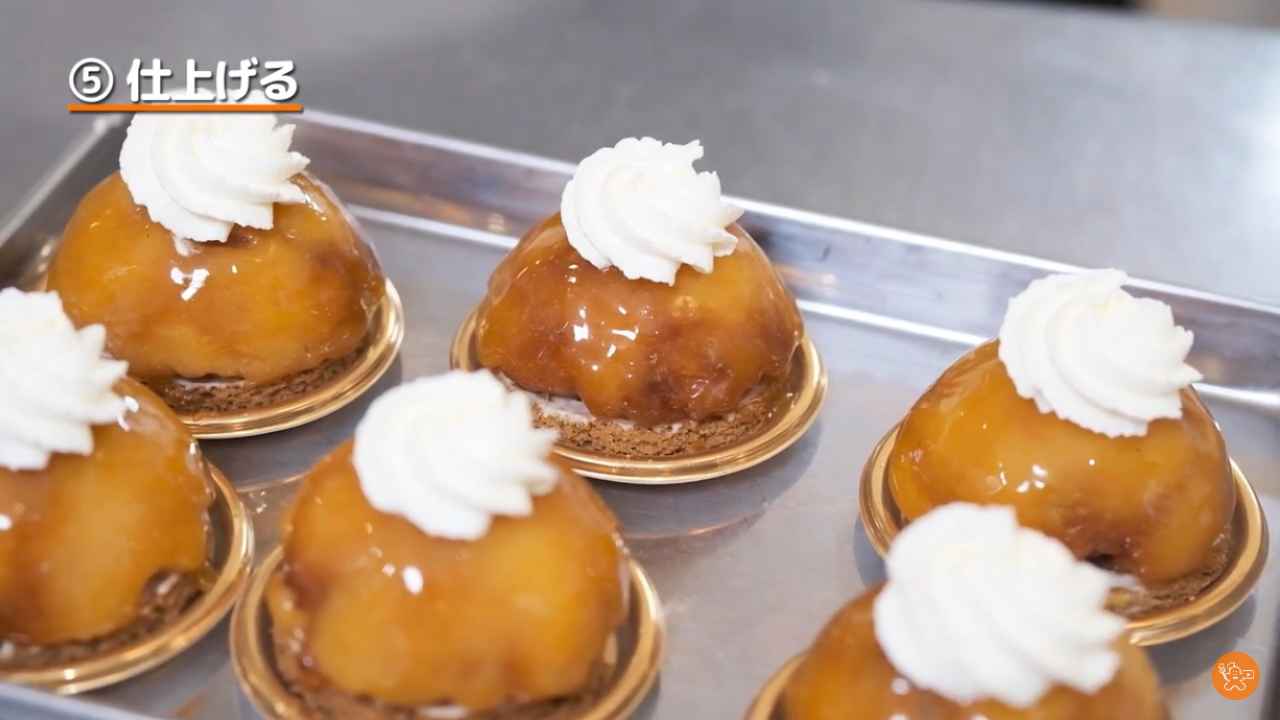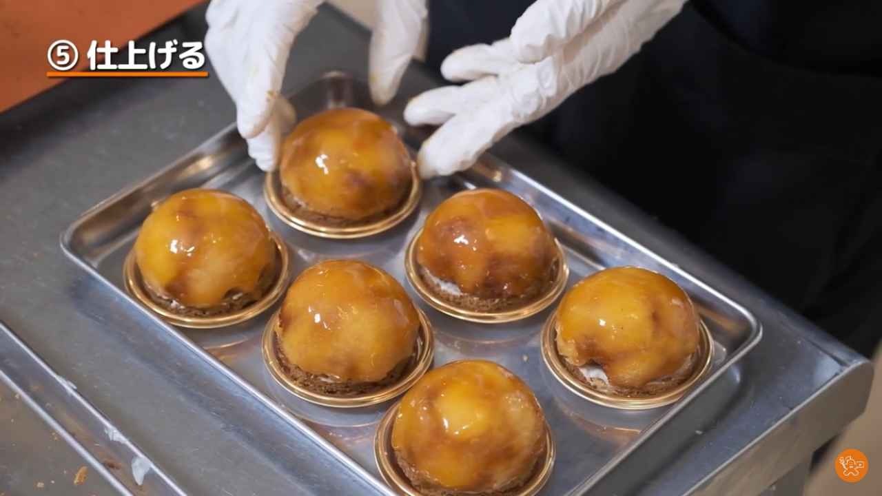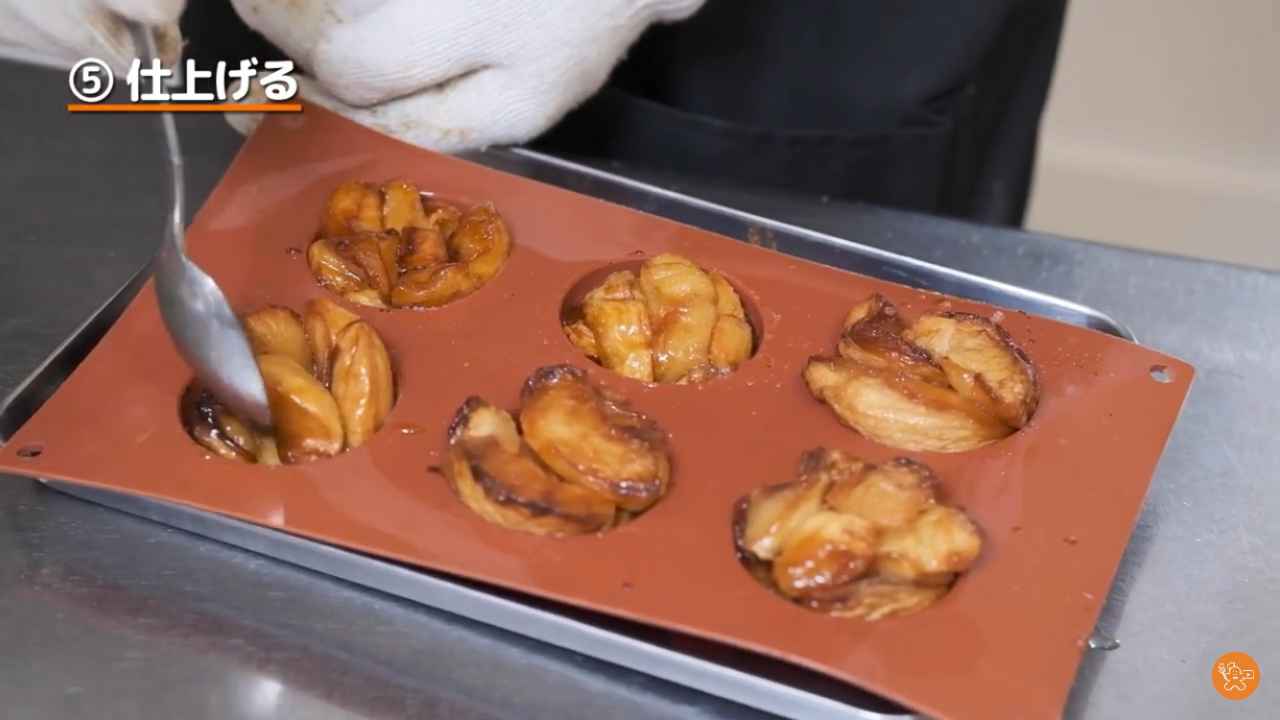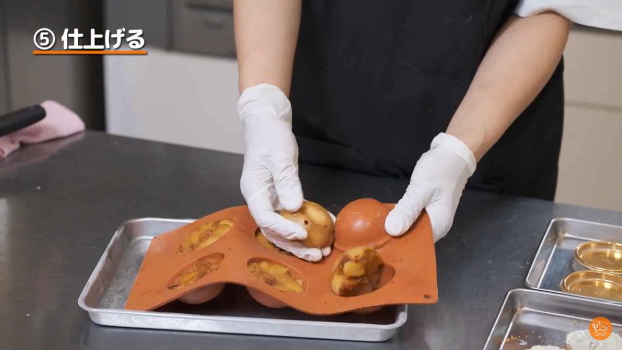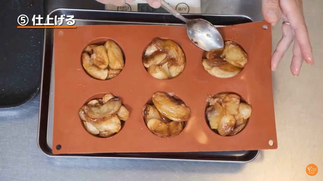 カラメルの入ったドーム型に焼きりんごを詰める。少しはみ出しても良い。