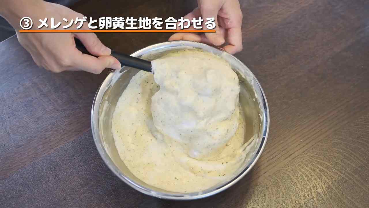 残りのメレンゲを加え、ゴムベラで生地全体をしっかりとすくいながら混ぜる。