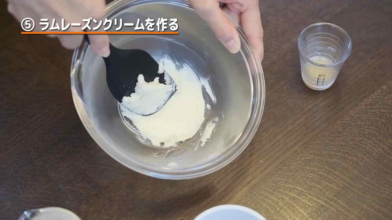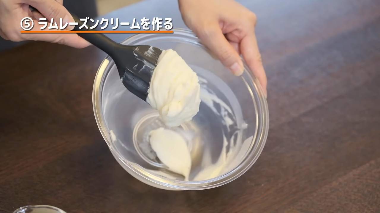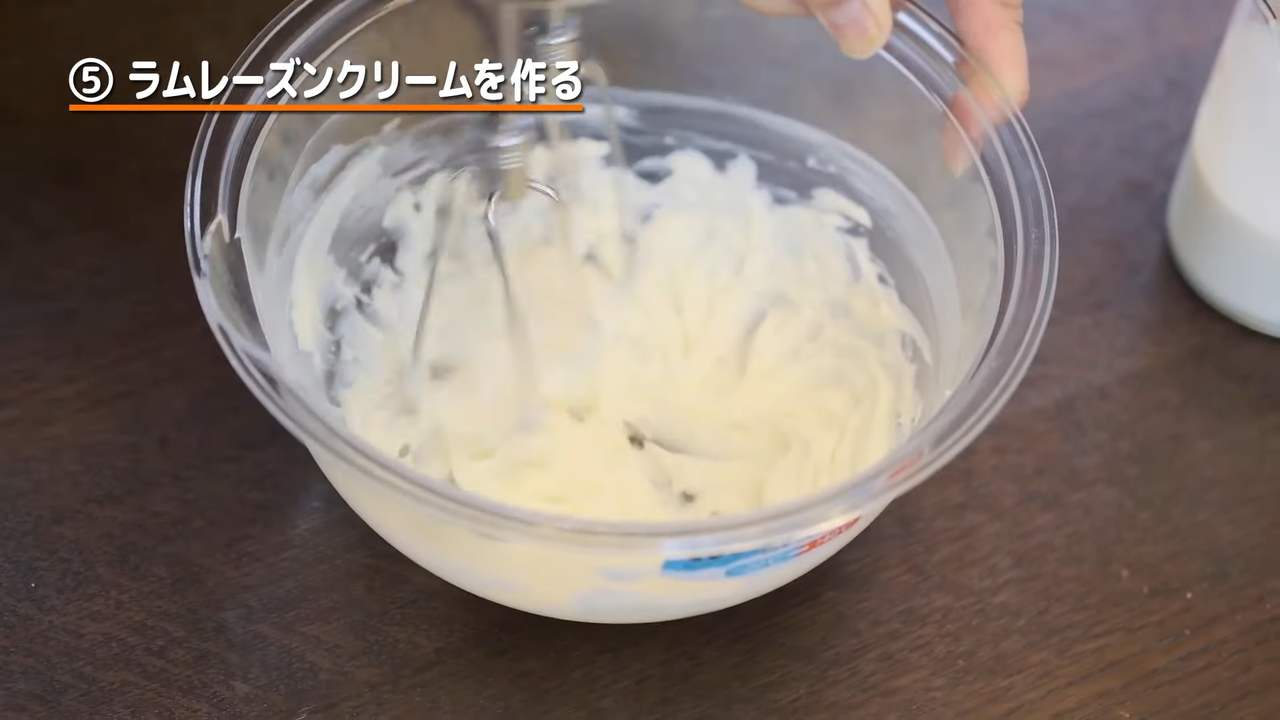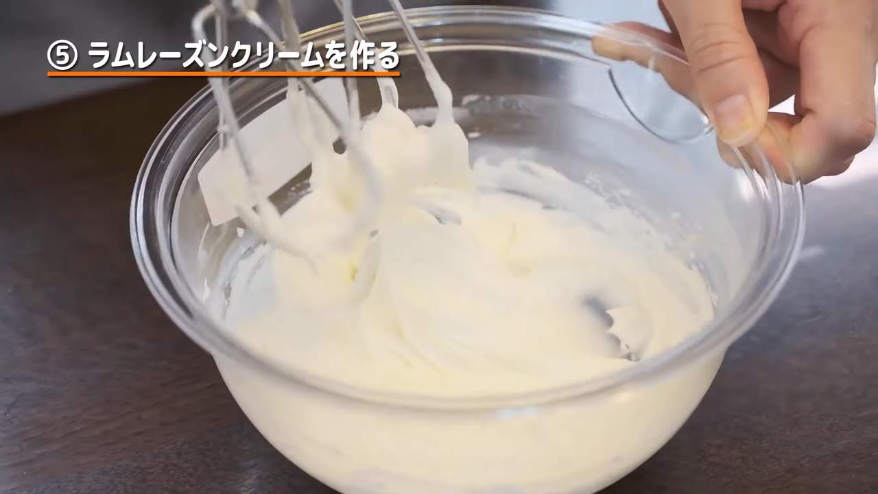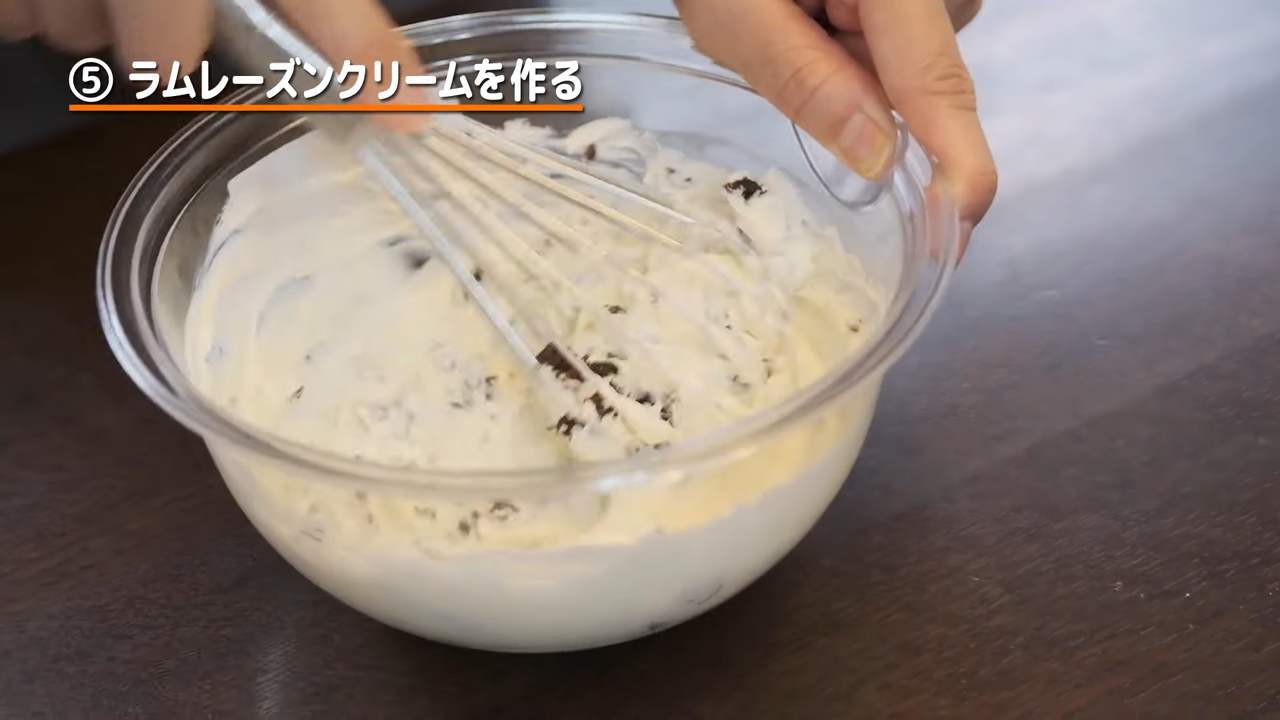 刻んだラムレーズンを加え、ホイッパーで絞れる硬さになるまで混ぜる。絞る直前まで冷やしておく。