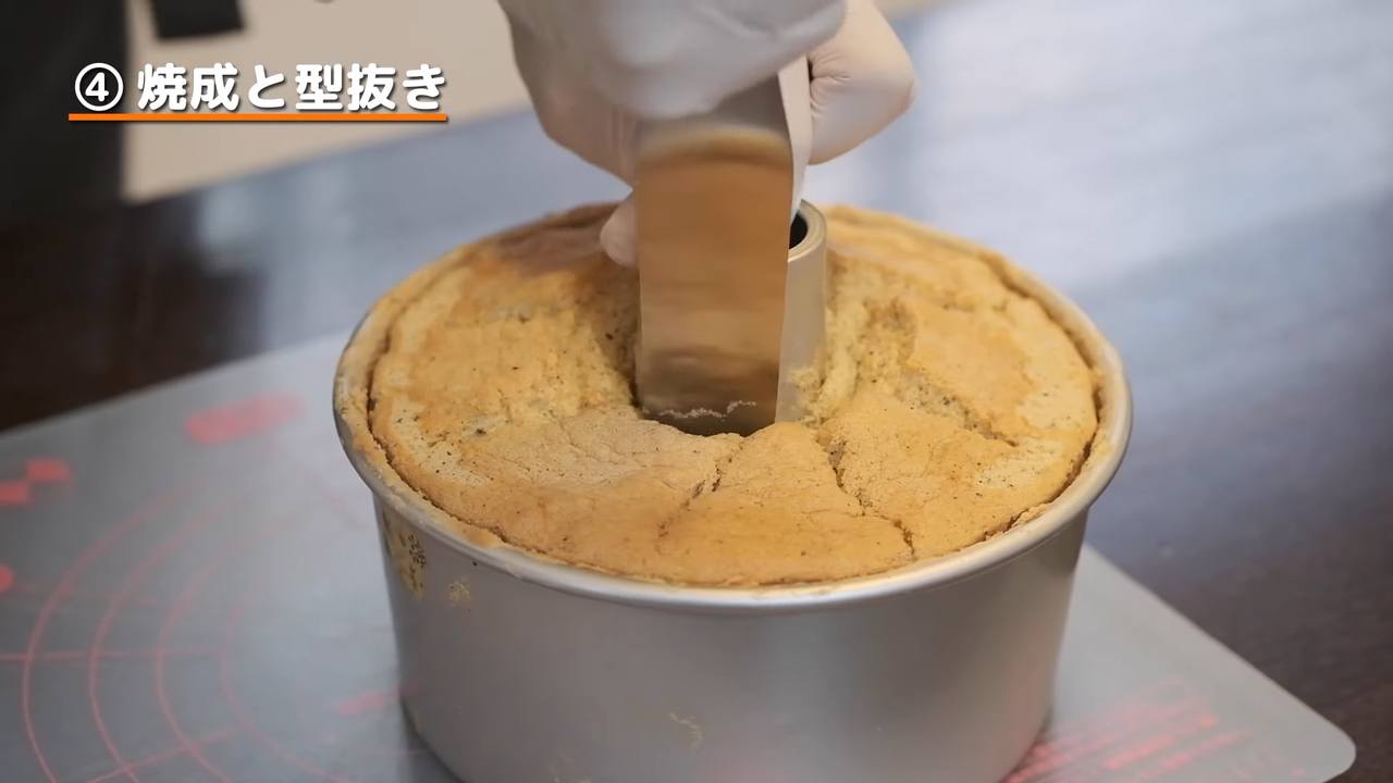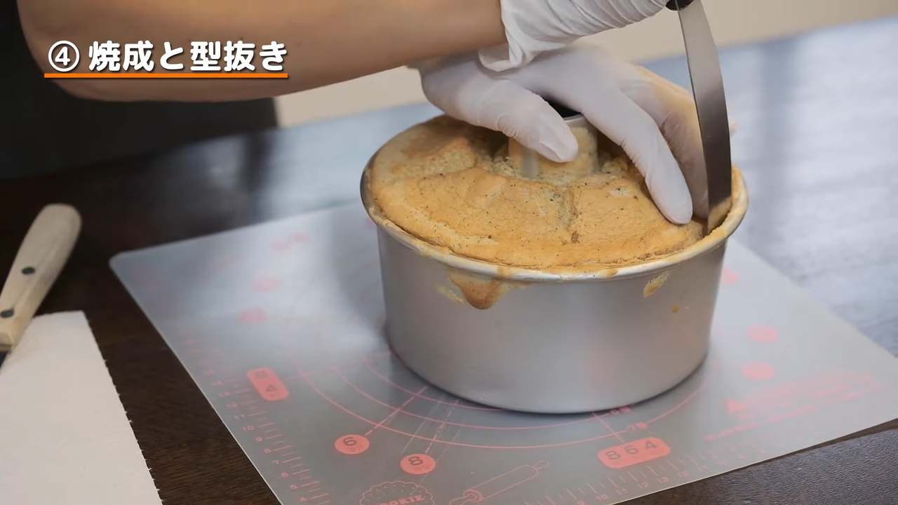 ラップを外し、シフォンナイフやパレットナイフなどで型抜きする。まず型を押さえる手で生地を少し手前に寄せる。ナイフを型に引っかけてぐっと内側にしならせながら底まで差し込み、そのまま上に引き抜く。型を回しながら、一刀ずつ入れて引き抜くことを繰り返す。- 4