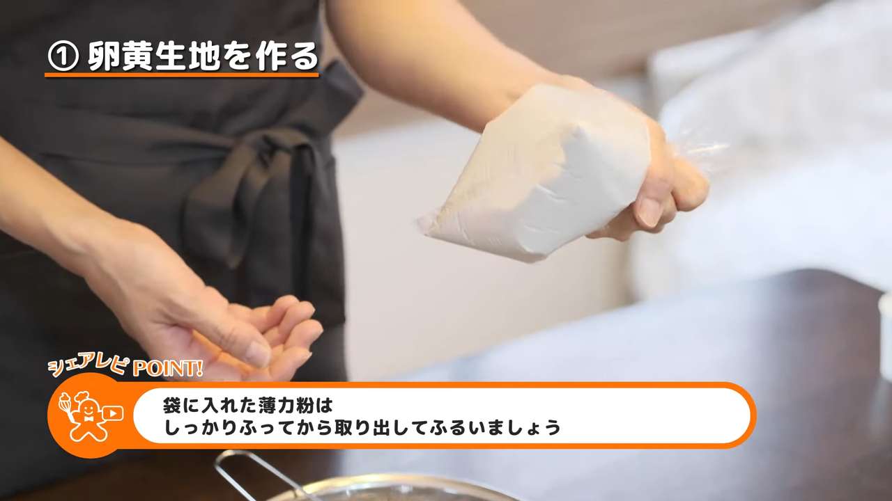 薄力粉を袋に入れ、しっかりと振って空気を含ませる。
