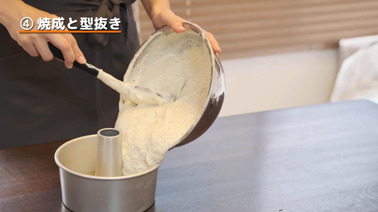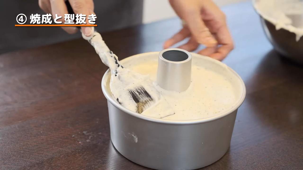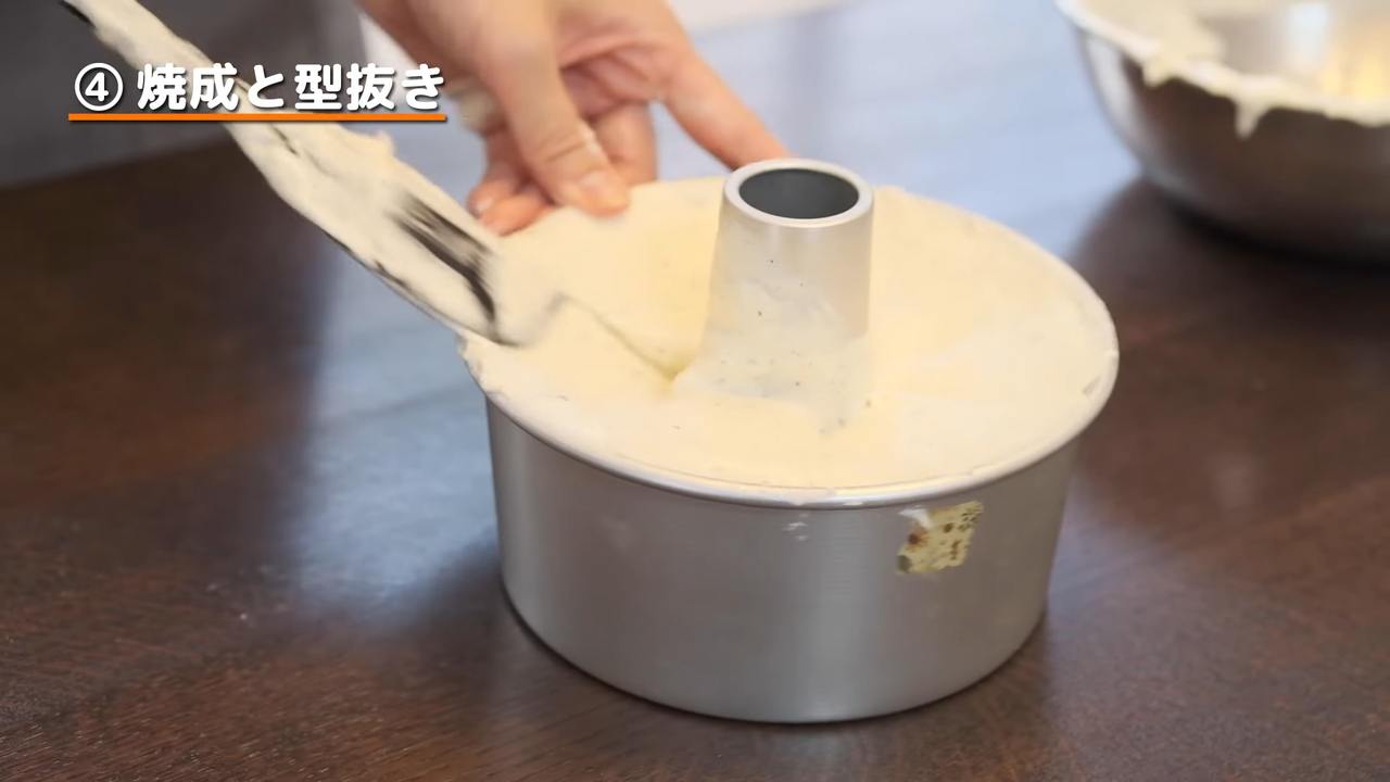 シフォン型へと、型の1ヶ所の低い位置からゆっくり流し入れる。- 2