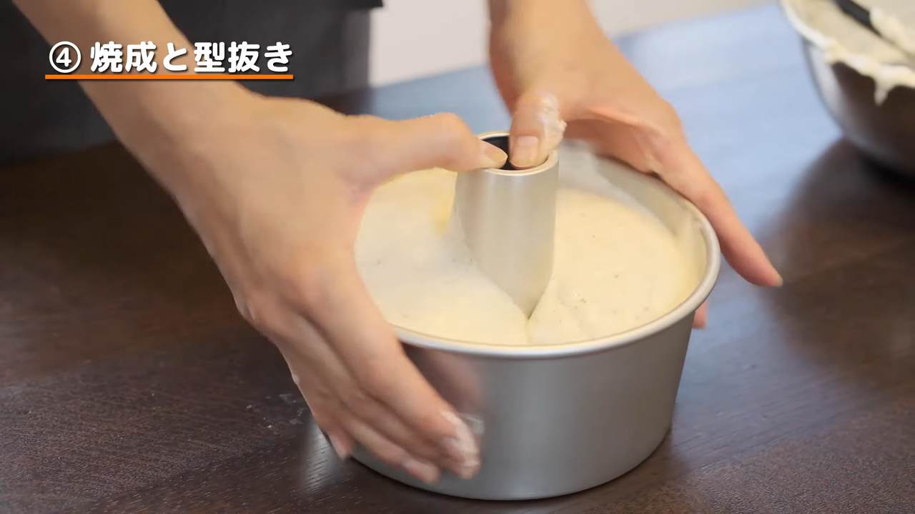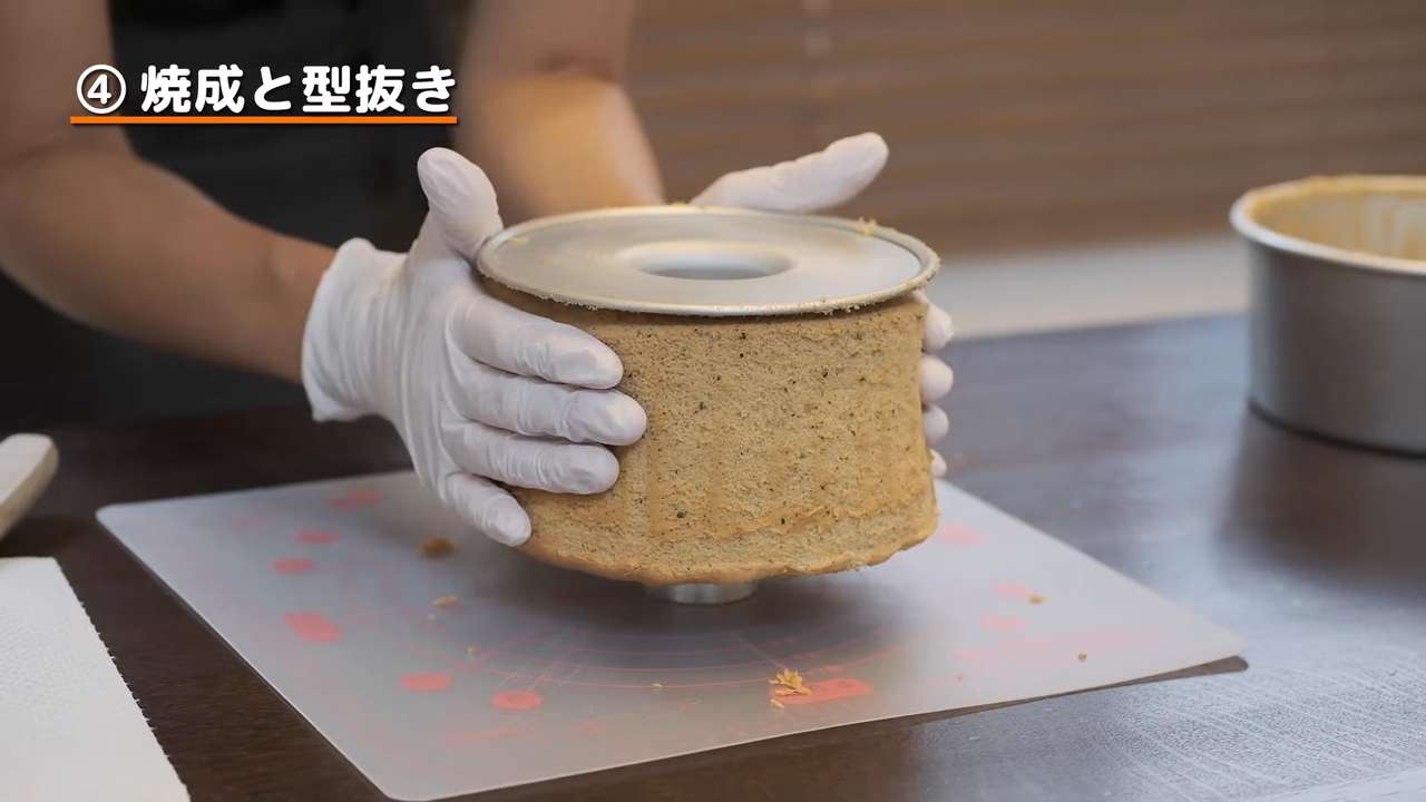 ひっくり返して外側の型を外す。生地の上部を優しく押さえながら少しずつ下ろしていく。全体を回しながら均等にはがす。