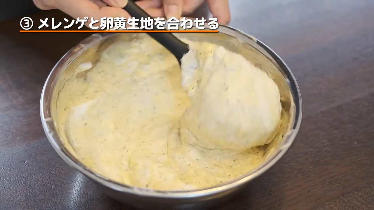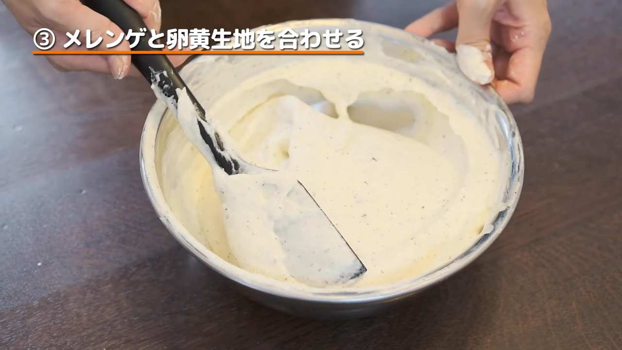 卵黄生地を混ぜ直す。メレンゲの1/3を卵黄生地のボウルへ入れ、卵黄生地をメレンゲにかぶせてから混ぜ始める。ボウルを回しながら、ゴムベラでボウルの底から生地をすくって反対側にうつすように混ぜる。