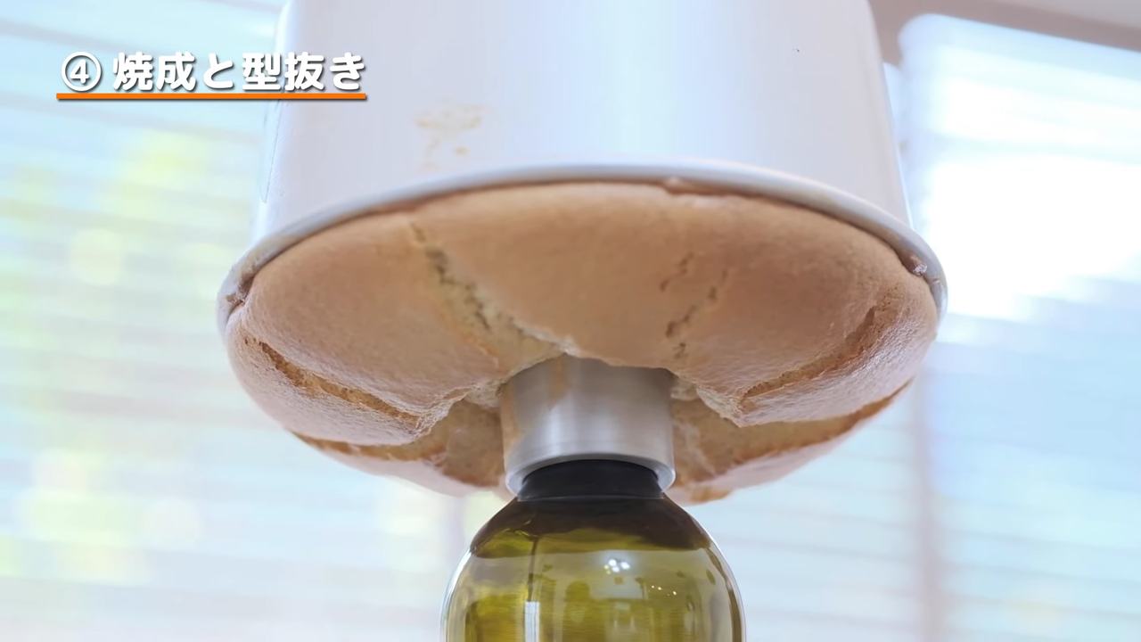 焼き上がったら型のまますぐに逆さまにする。ワインの瓶やココットを利用するとよい。10~15分程度粗熱が取れるまで冷ます。