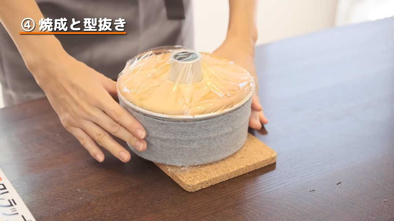 ※ケーキがしぼむのを防ぐため、しっかりと冷めるまでは、型は逆さまの状態を保持する。- 2