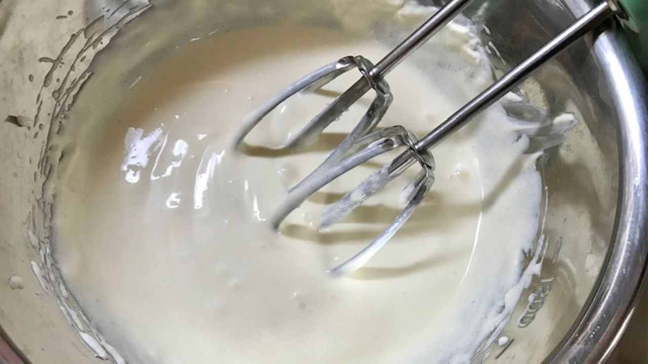 1へバニラアイスクリームを入れ、再びハンドミキサーで全体が均一になるまで混ぜ合わせます。