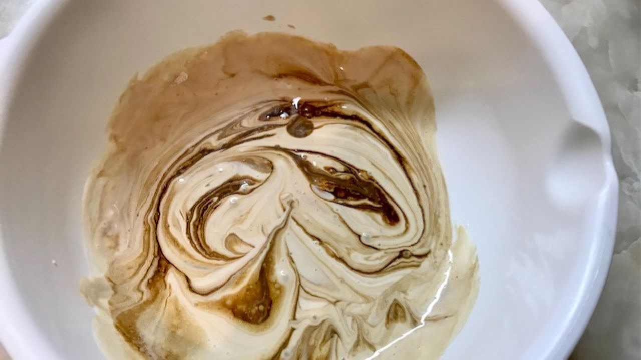 2のティラミスクリームを100g程度別のボウルへ移したら、予め用意したコーヒー液を全て入れて混ぜます(コーヒークリーム)。