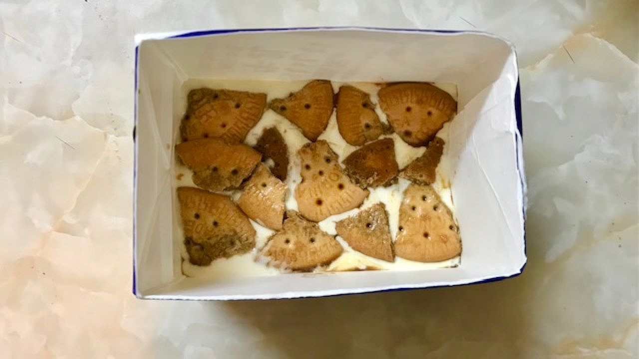 牛乳パックの型に2を約半量流し入れて、適当な大きさに割ったビスケットをコーヒーシロップに軽く浸し、全体にすき間なく敷き詰めます。