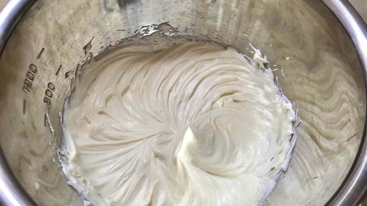 ボウルにクリームチーズを入れ、ハンドミキサーの低速でなめらかになるまで練り混ぜ、マスカルポーネと砂糖を加えて更に混ぜます。
