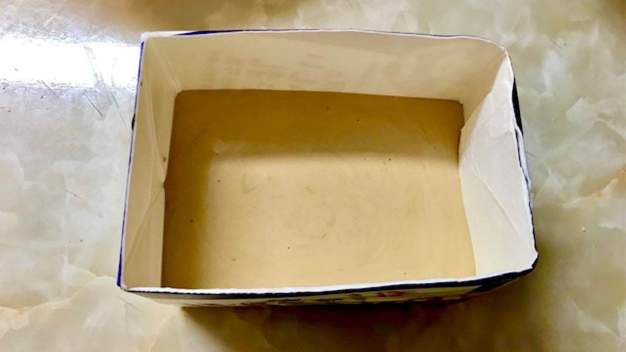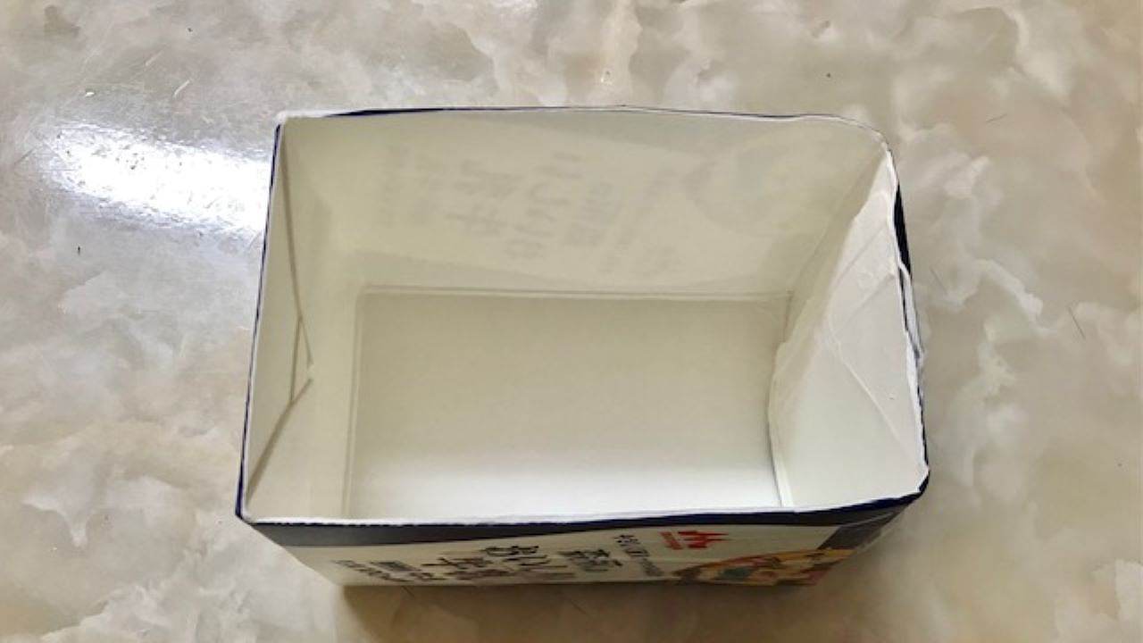 500ml牛乳パックを利用して型を作ります。洗って乾燥させた牛乳パックをキッチンバサミで画像のように1辺をカットし、テープでとめます。