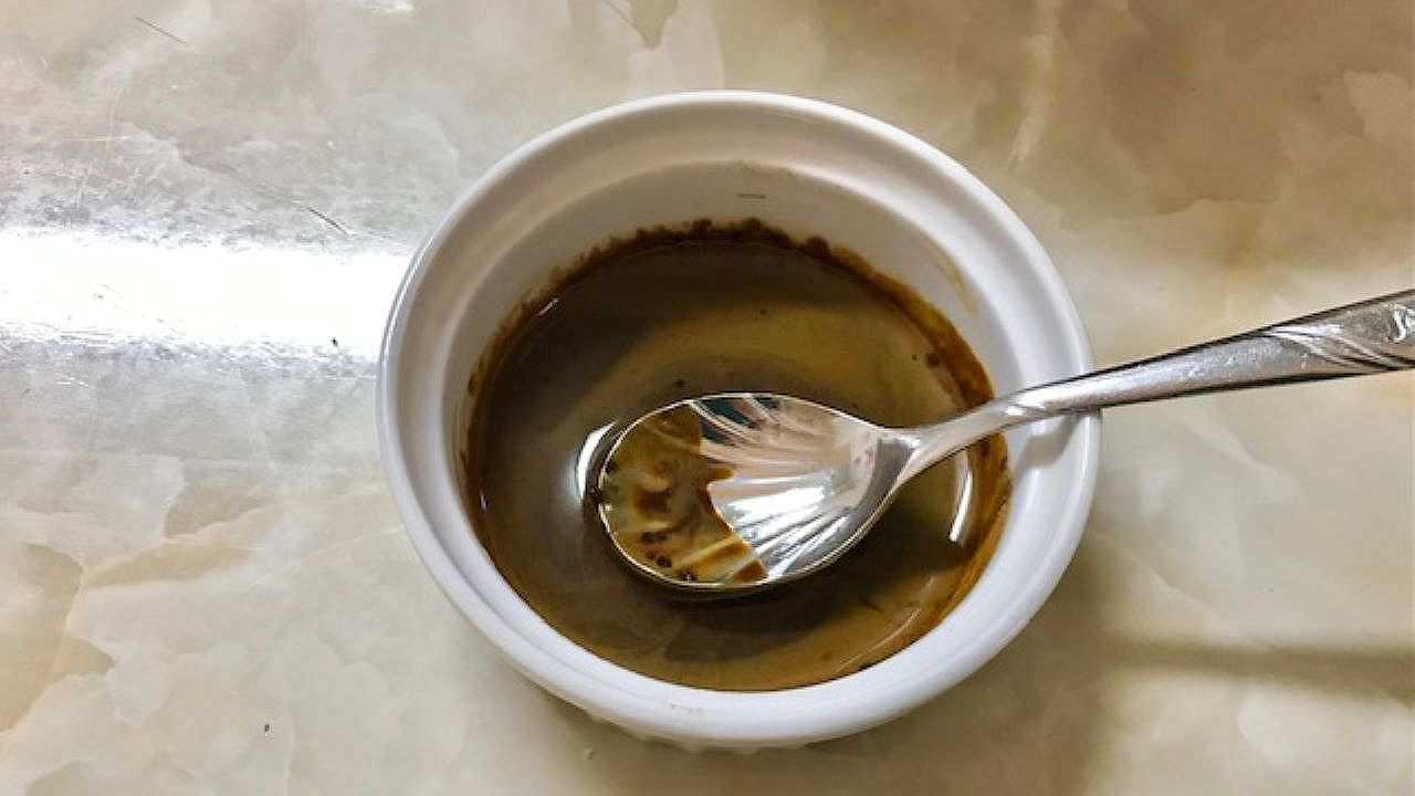 容器にインスタントコーヒー、砂糖、お湯を入れて良く混ぜ合わせます。