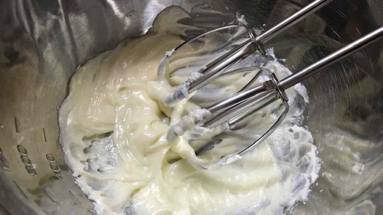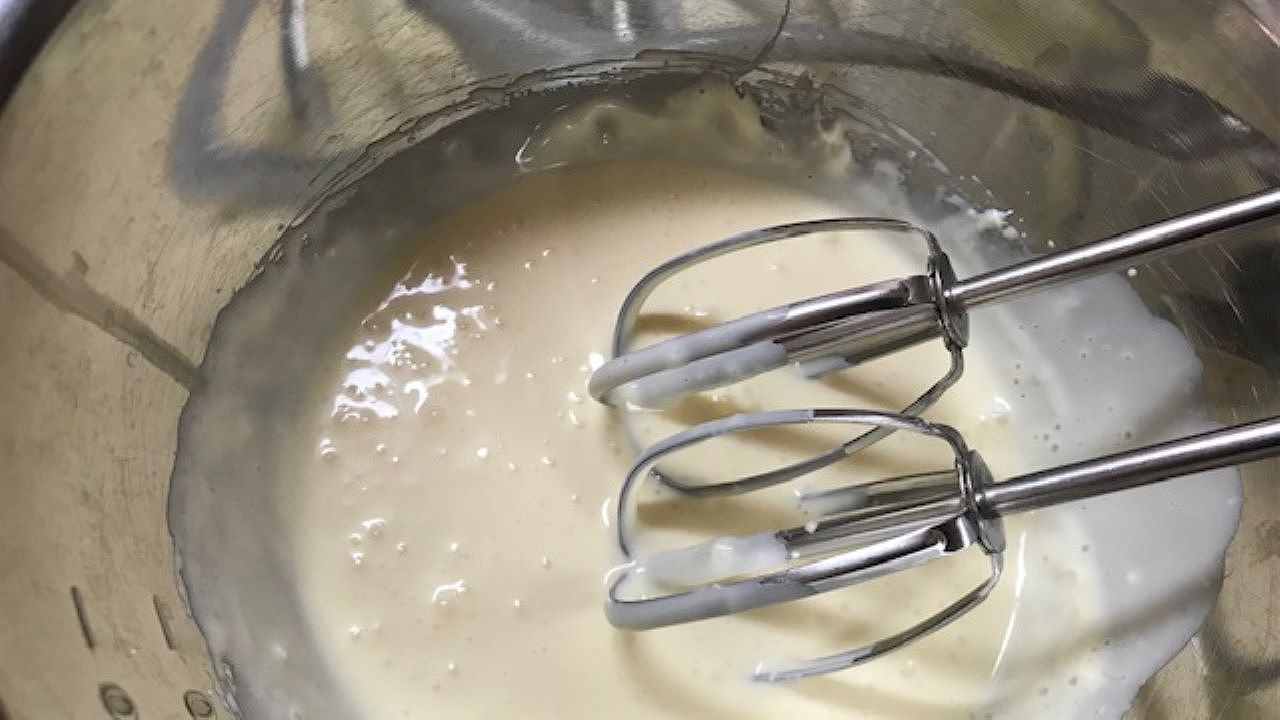卵を入れて混ぜ合わせたら、生クリームを加えてハンドミキサーでもったりするまで混ぜます。