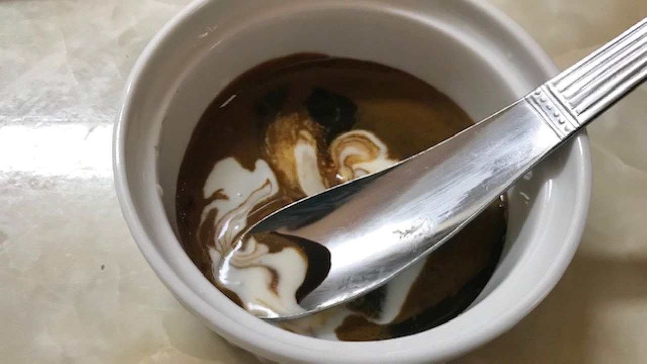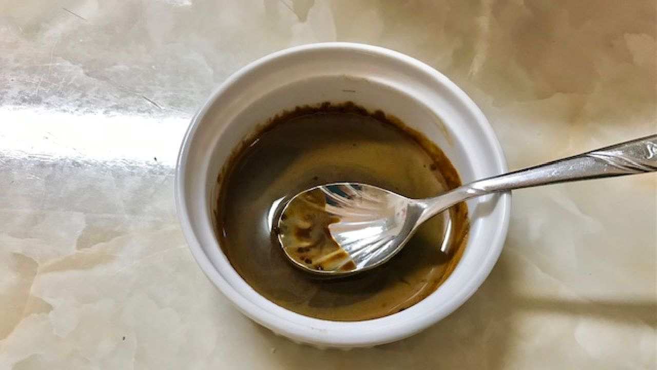 残りのコーヒー液の中に3のティラミスクリームを小さじ1程度加えて混ぜ合わせます。