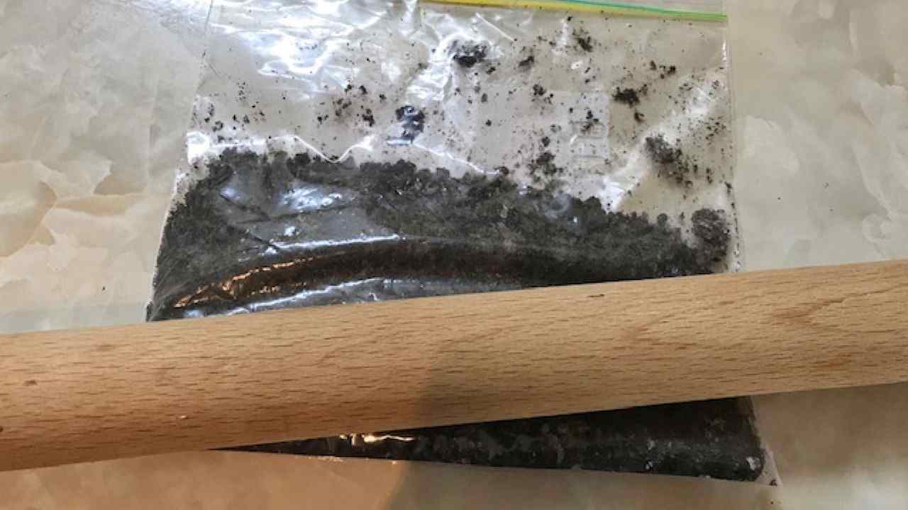 丈夫なポリ袋にクリームを除いたココアクッキーを入れ、麺棒を転がして細かく砕きます。