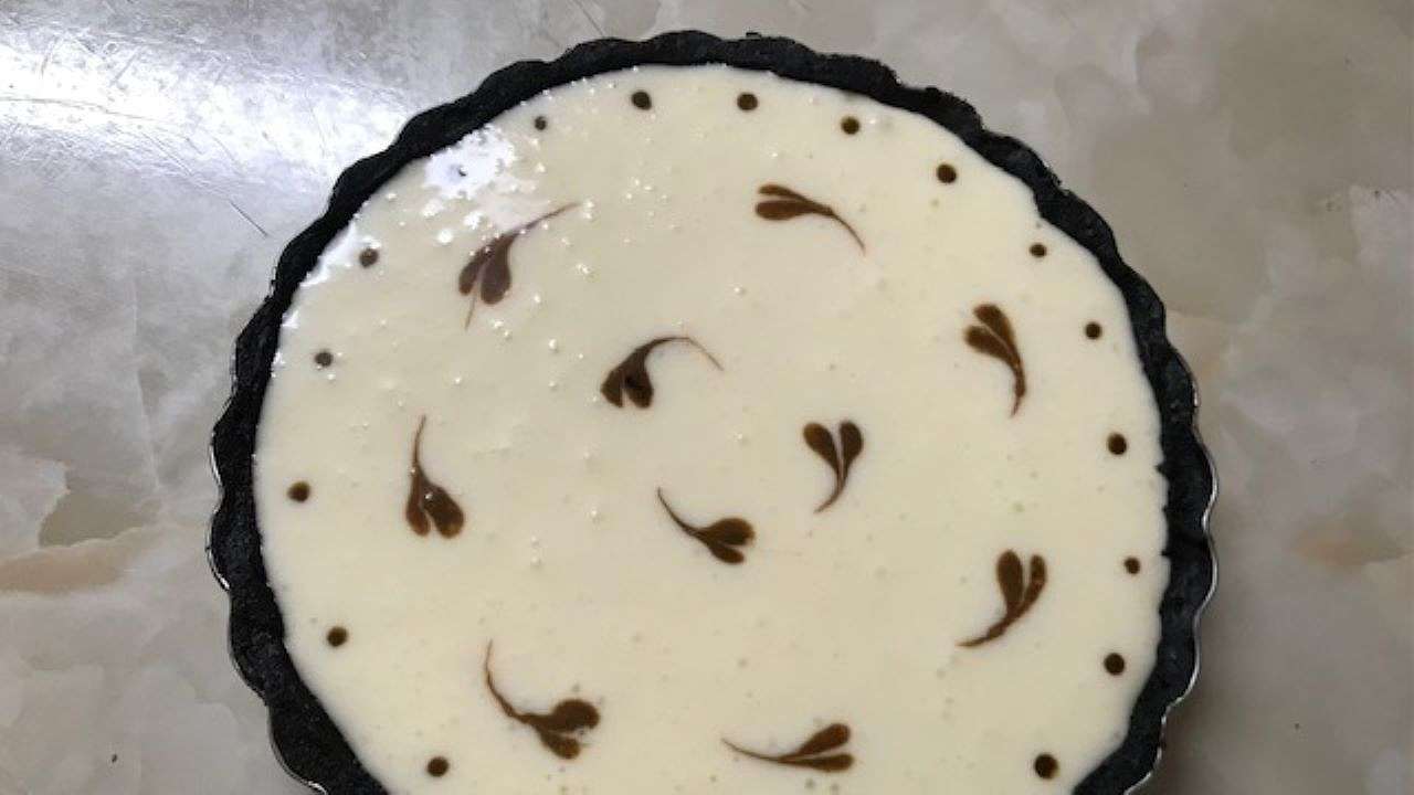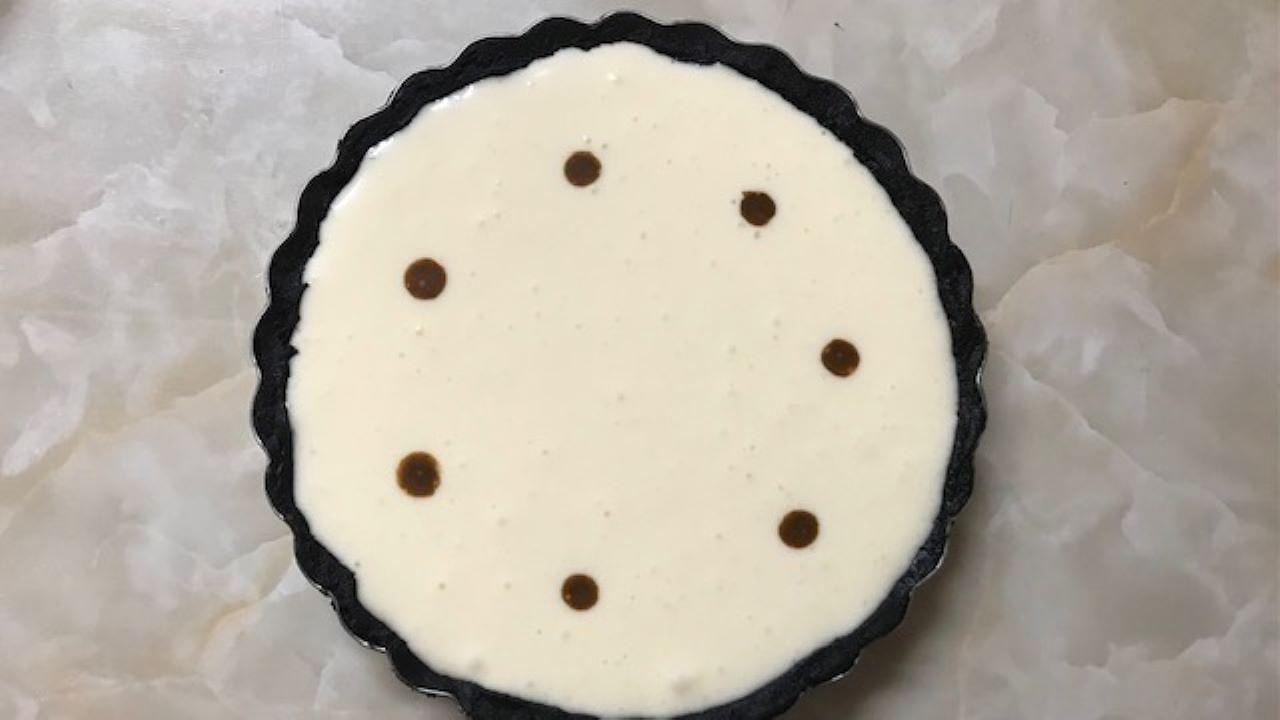 タルト台に3のティラミスクリームを流し入れたら、4のコーヒー生地を等間隔に丸く落とします。ティースプーンを利用するとスムーズです。