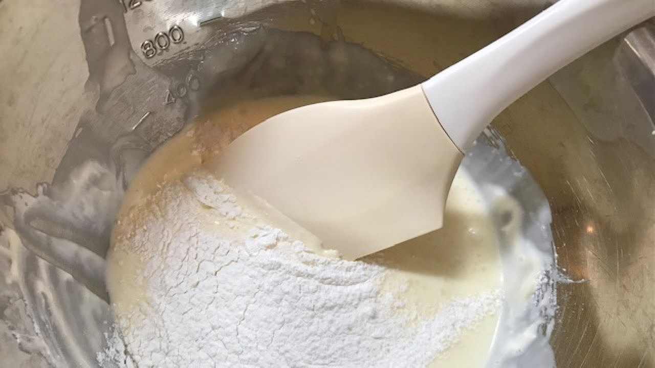 レモン果汁を入れて良く混ぜたら、薄力粉をふるいながら加えます。さっくりと切るように混ぜます。