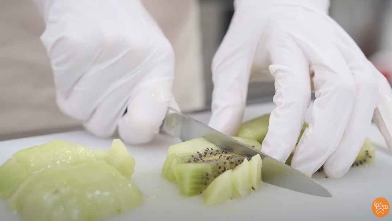キウイフルーツの皮をむき、1cm角位にカットする。- 2