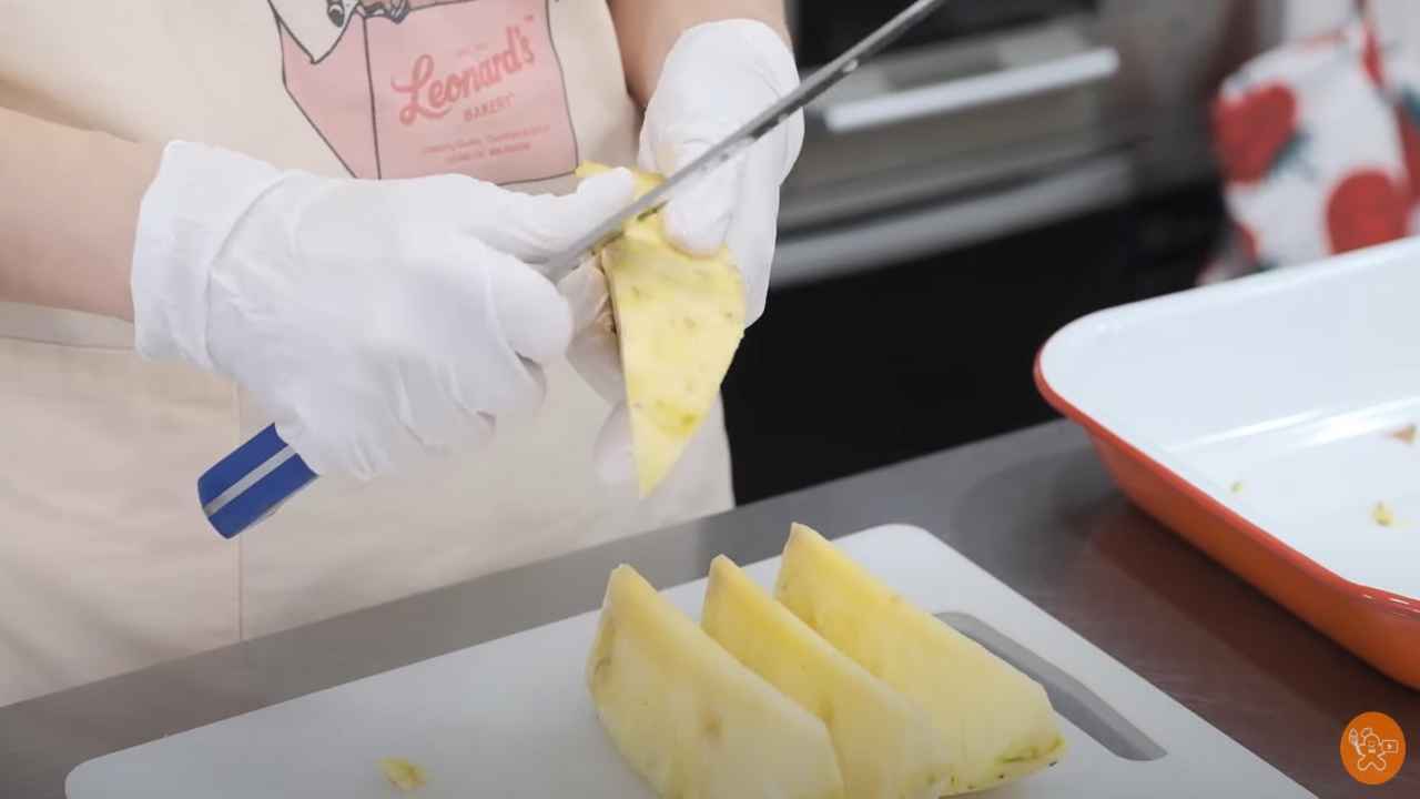 パイナップルの皮をむき、縦8等分にカットして5mm厚のいちょう切りにする。