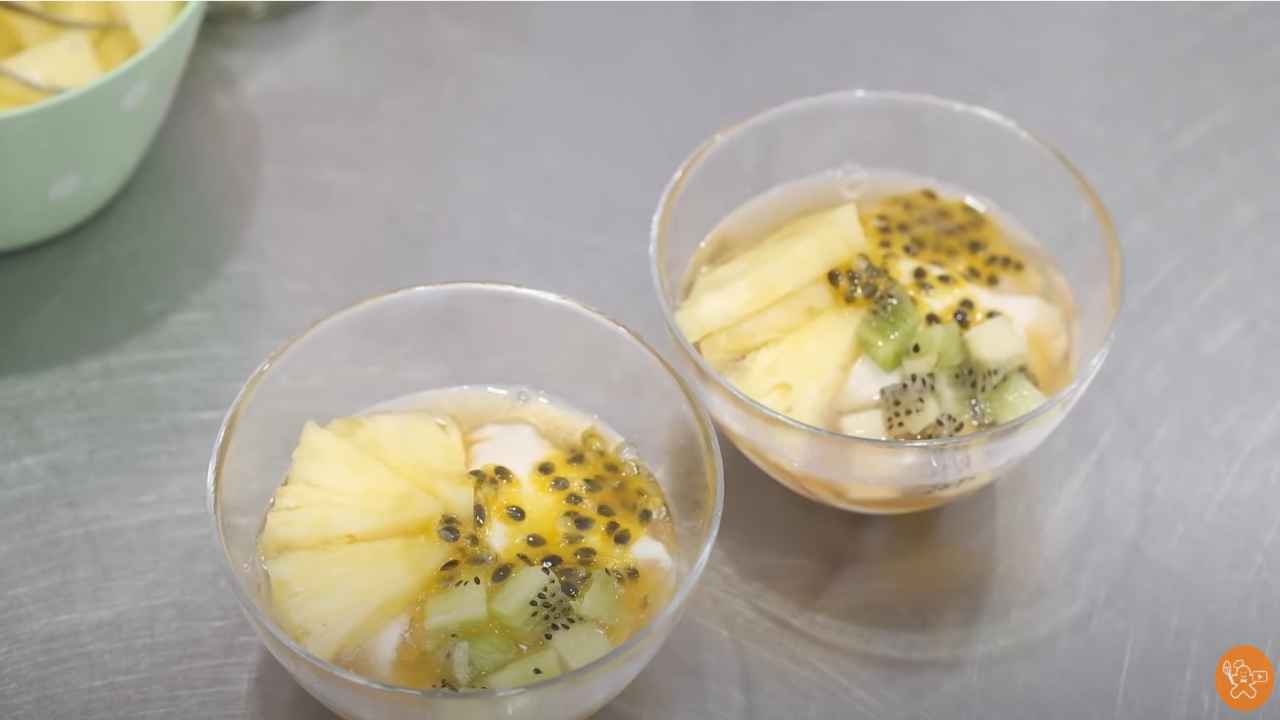 パッションフルーツソース(大さじ1)をかけて、パイナップル(5~6枚)とキウイフルーツ(大さじ山盛り1杯)をトッピングする。