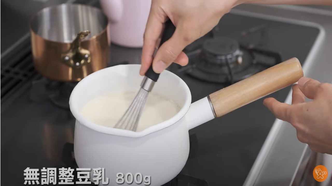 鍋に豆乳を入れて、焦げないように混ぜながら中弱火にかけて沸騰直前まで温める。- 2
