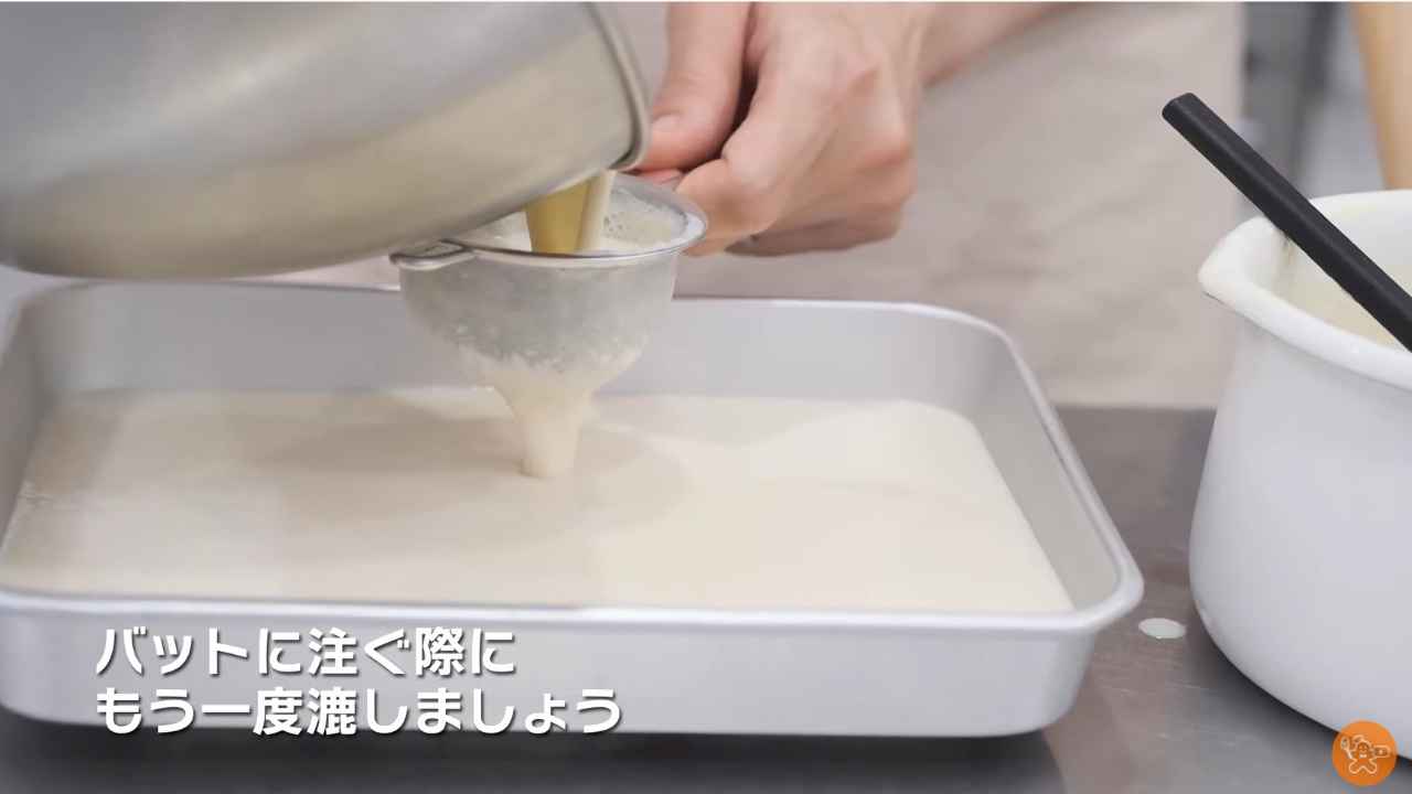 2~3回漉してバットに注ぎ、粗熱を取ってから冷蔵庫で1時間以上冷やし固める。