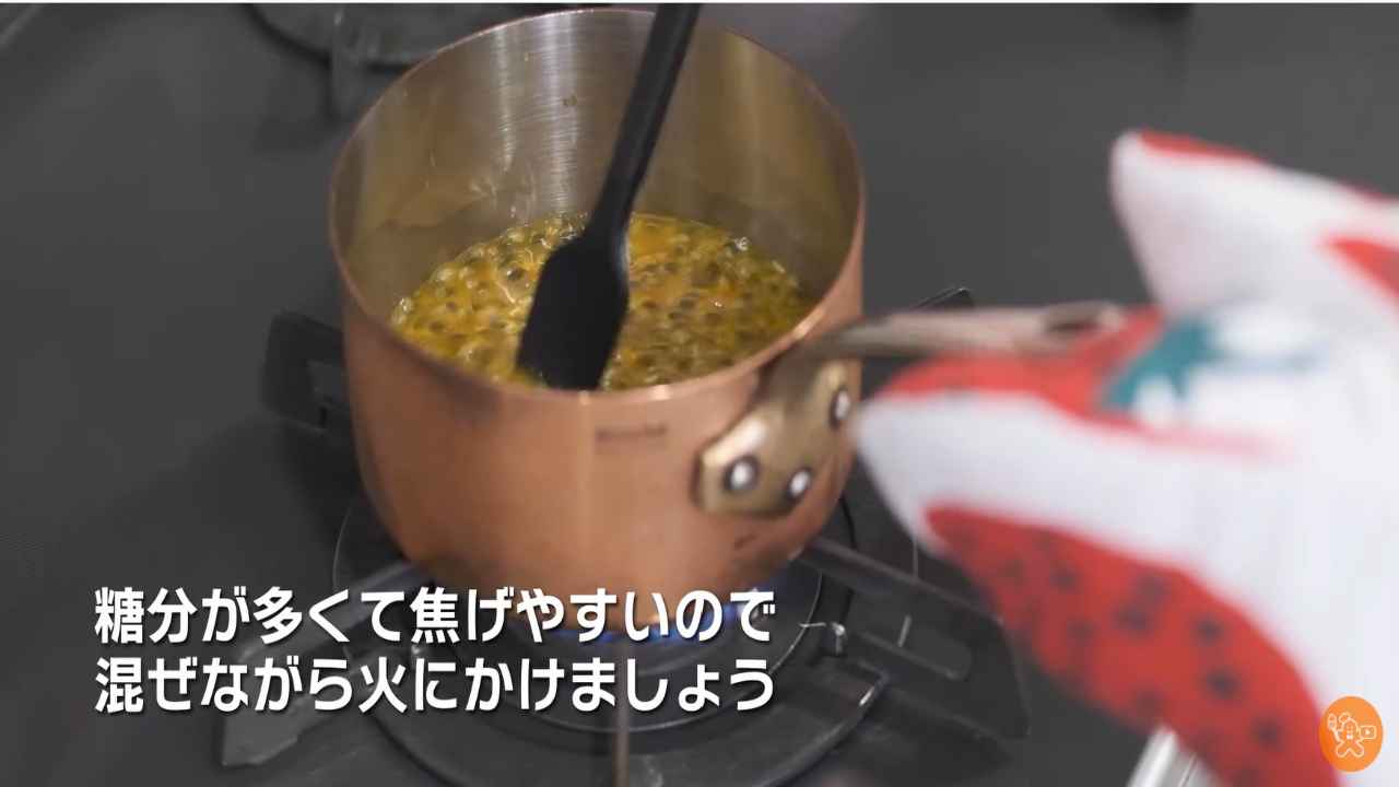小鍋にパッションフルーツの果肉とグラニュー糖を入れて、混ぜてから弱火にかける。- 2