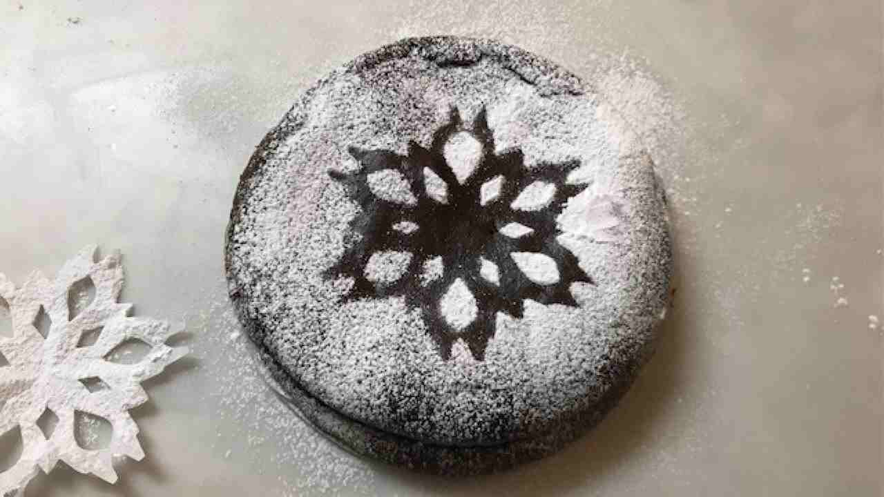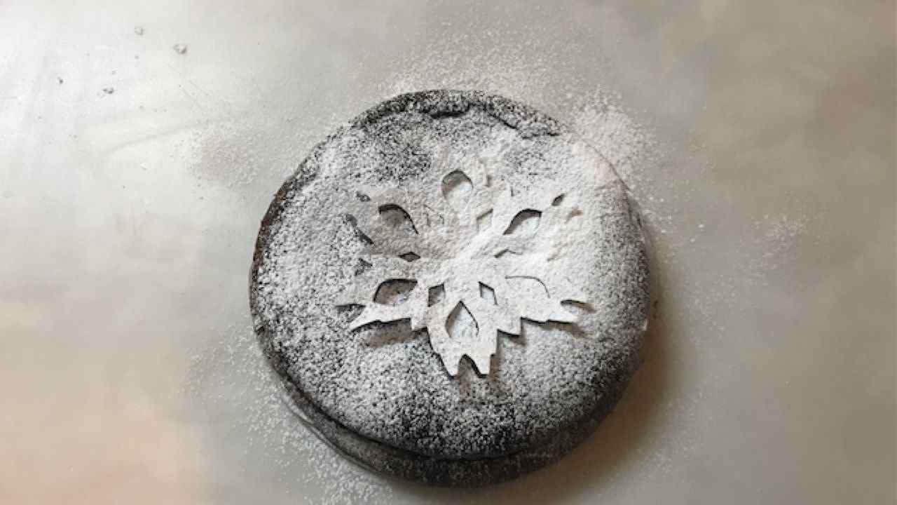 ○粉糖の振り方を工夫すると、華やかでおしゃれな仕上がりになります。クッキングシートを使って、折り紙で作る切り絵の要領でカット。